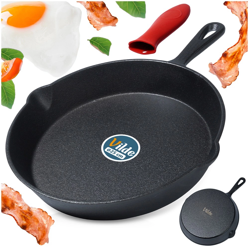 Robustná liatinová panvica s priemerom 25 cm so skvelou akumuláciou tepla na rýchle a rovnomerné vyprážanie, dusenie aj pečenie. Dve praktické výlevky uľahčia zlievanie, červený silikónový návlek na rukoväť zaistí bezpečný úchop. Vhodná na plyn, elektrinu, keramiku, halogén aj indukciu a tiež do rúry či na gril.