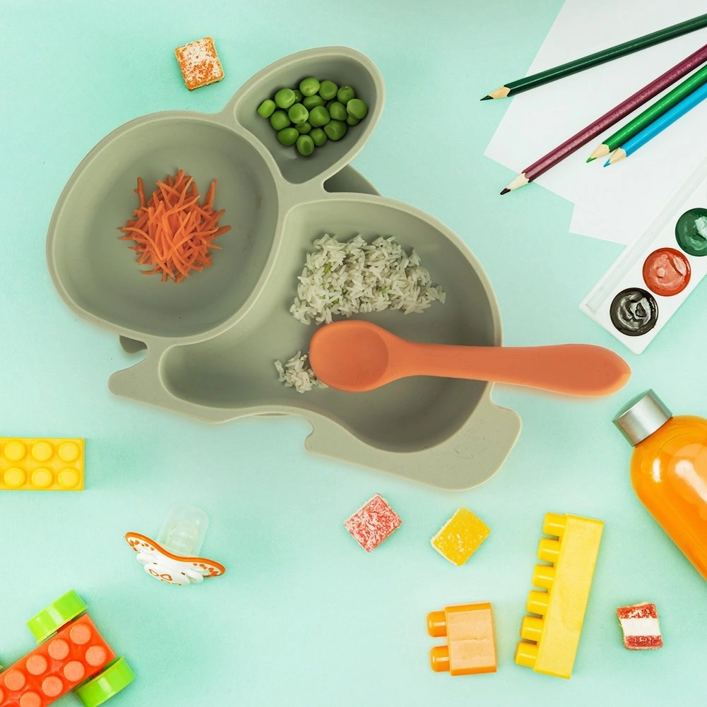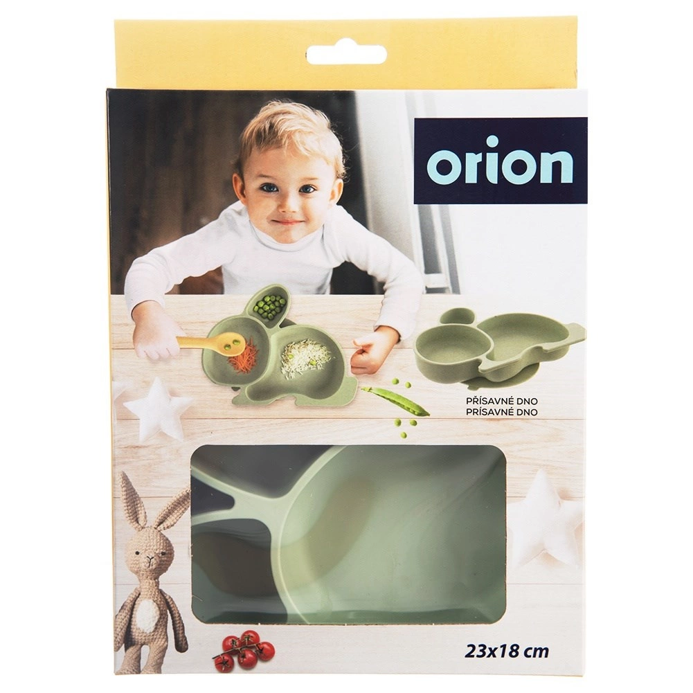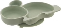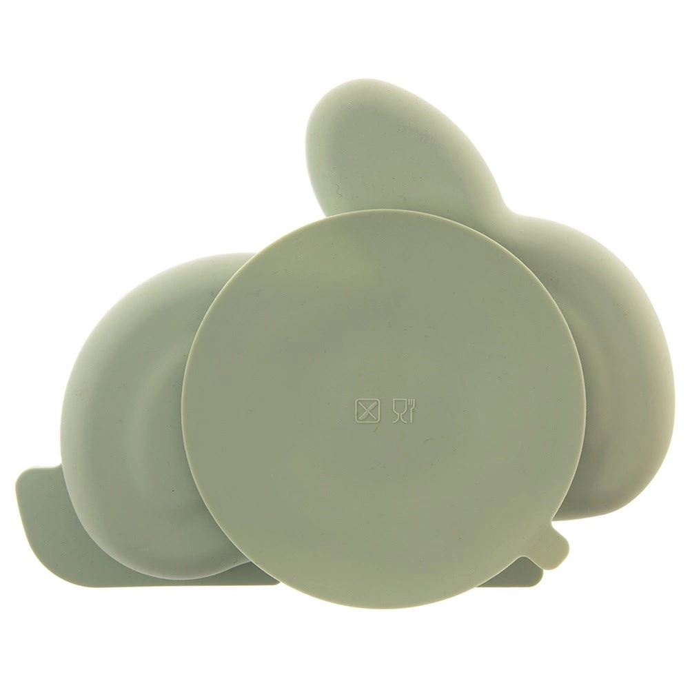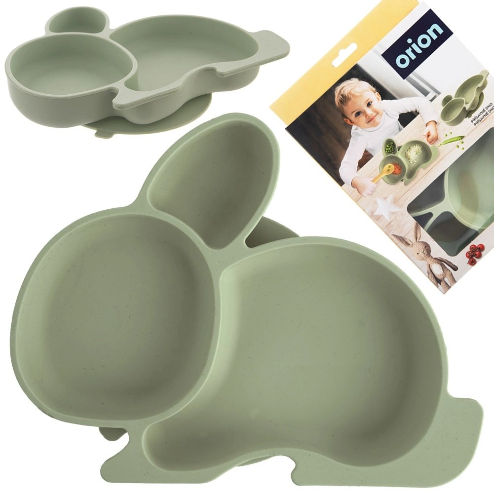 Praktický detský tanierik s tromi priehradkami v tvare zajačika na pohodlné servírovanie jedál a desiat. Vďaka silnej prísavke pevne drží na stole, odolá teplotám od -20 °C do +120 °C a je vhodný do umývačky, mikrovlnky aj mrazničky. Vyrobený z kvalitného silikónu v zelenej farbe.