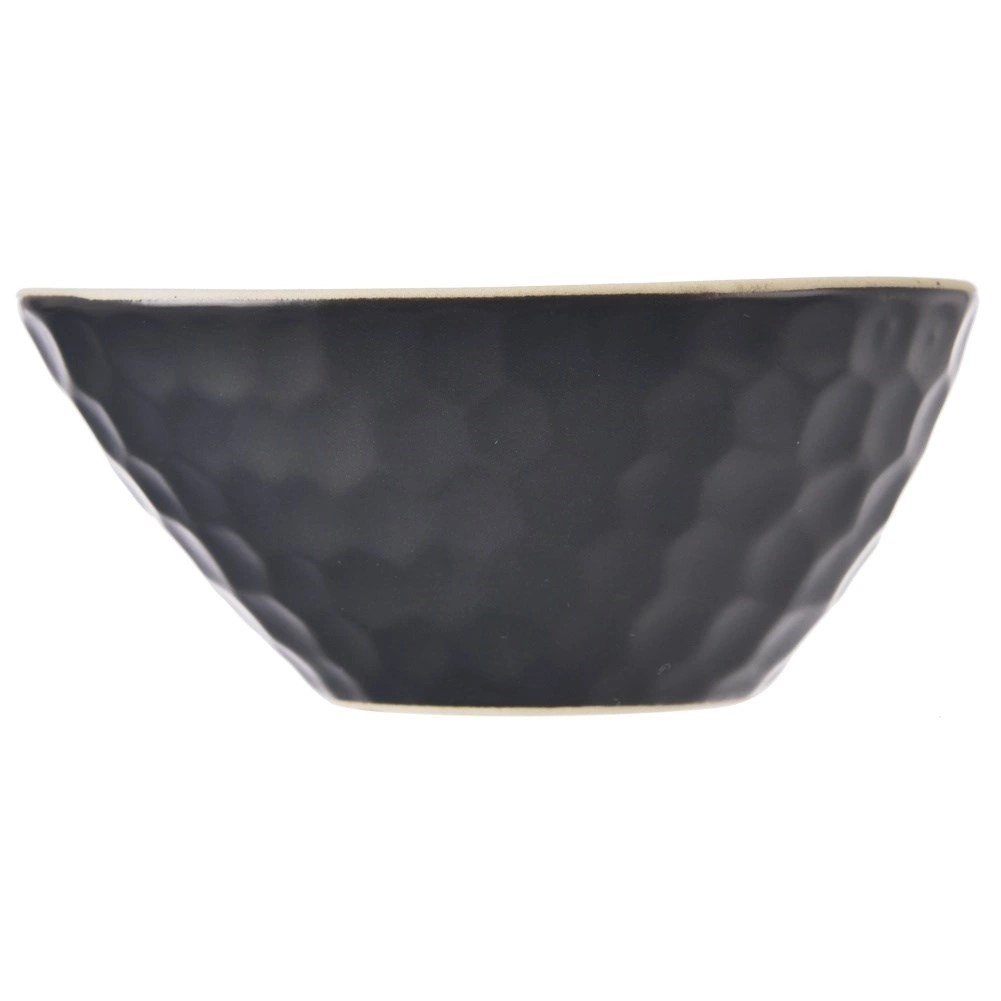 Elegantná miska z kvalitnej kameniny v čiernej farbe je perfektná na každodenné servírovanie aj slávnostné príležitosti. Vďaka praktickým rozmerom 11 × 8,5 × 4,5 cm pohodlne naservírujete oriešky, sušené ovocie, olivy, malé šaláty aj dezerty. Povrch s efektom plástu dodáva originálny vzhľad a zároveň príjemne padne do ruky.