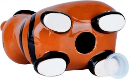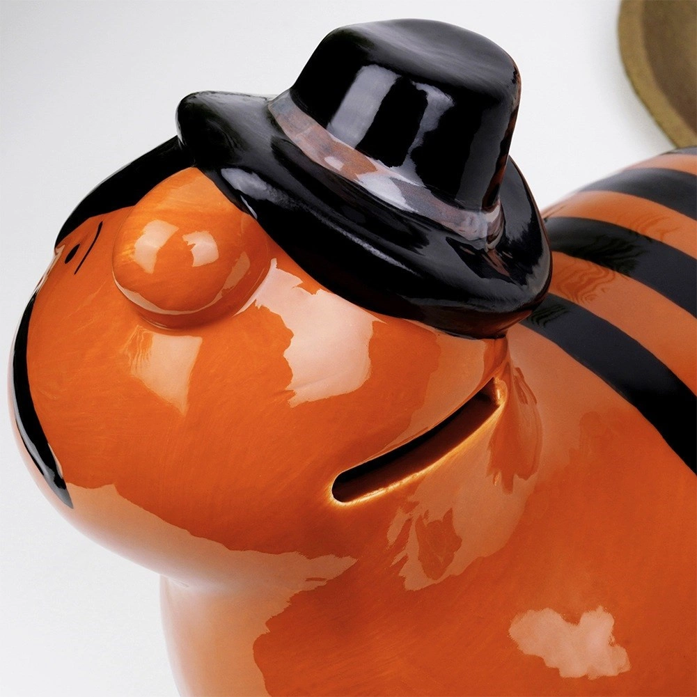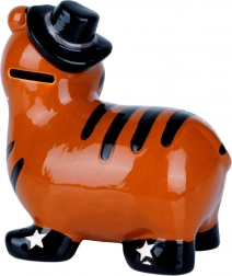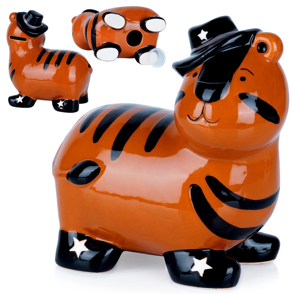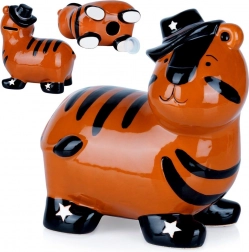 Táto keramická pokladnička v tvare tigra spája funkčnosť a dekoratívny vzhľad. Lesklý oranžový povrch s čiernymi pruhmi, klobúkom a hviezdami na topánkach dodáva hravý charakter, ktorý oživí detskú izbu aj moderný interiér. Vďaka spodnému otvoru s vyberateľnou zátkou môžete úspory vyberať opakovane bez rozbíjania.