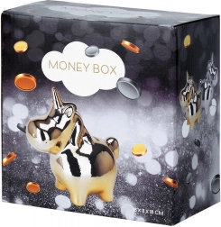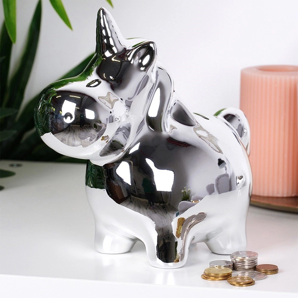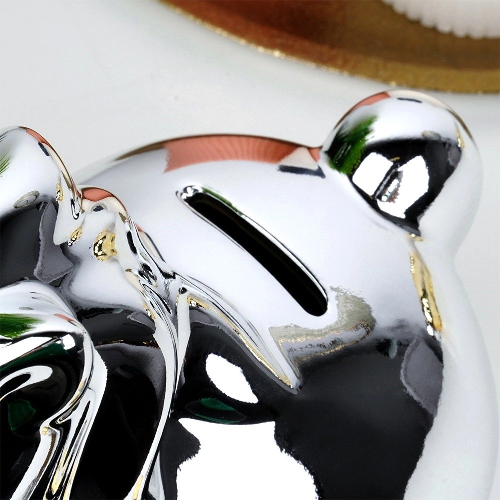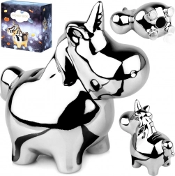 Táto keramická pokladnička jednorožec vyniká zrkadlovým strieborným povrchom, ktorý dodá vášmu domovu nádych glamour. S rozmermi 18 × 10,5 × 18 cm ponúka dostatok priestoru pre drobné mince aj zložené bankovky, pričom stabilne stojí na polici, komode či pracovnom stole.