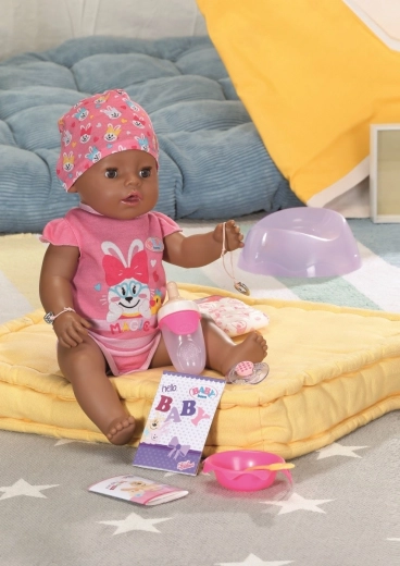 Bábika BABY Born s kúzelným cumlíkom, tmavá pleť, 43 cm, má na sebe body a čiapku. Súčasťou balenia je nočník, plienka, tanierik s lyžičkou, porcia kašičky, fľaštička, kúzelný cumlík, rodný list pre bábiku a náramky priateľstva pre bábiku a jej malú mamičku.