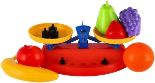 - Detská kuchynská váha, 7 ks plastového ovocia, závažia