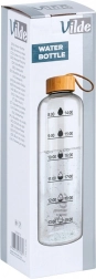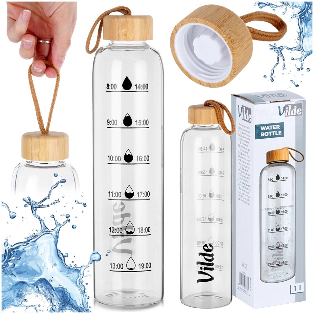 Štýlová sklenená fľaša na vodu s objemom 1 l z odolného borosilikátového skla s bambusovým skrutkovacím viečkom a textilnou slučkou. Vďaka silikónovému tesneniu nepretečie a časové značky na tele fľaše motivujú k pravidelnému pitiu počas dňa. Vhodná na teplé aj studené nápoje, ľahko sa udržiava a je bezpečná do umývačky.
