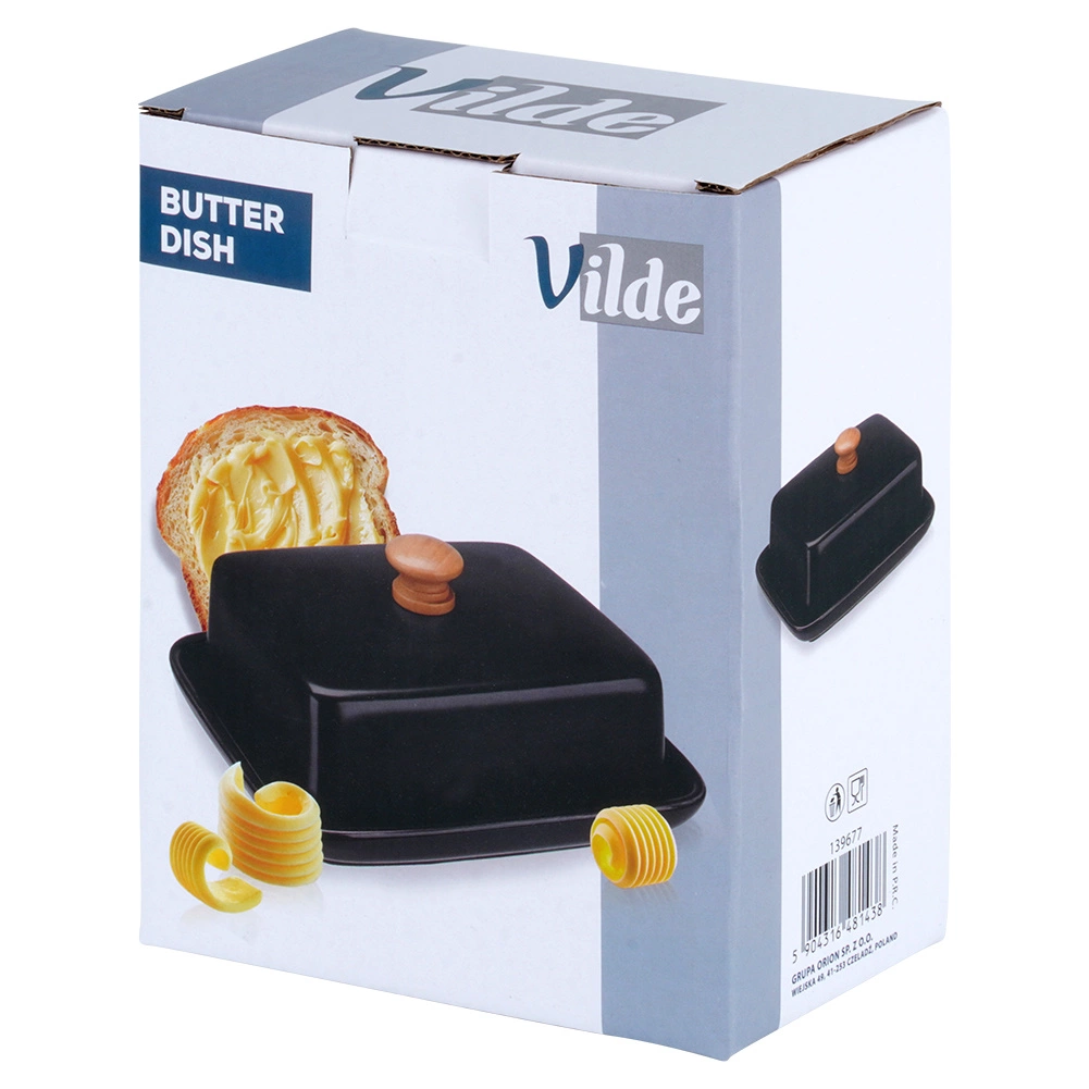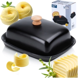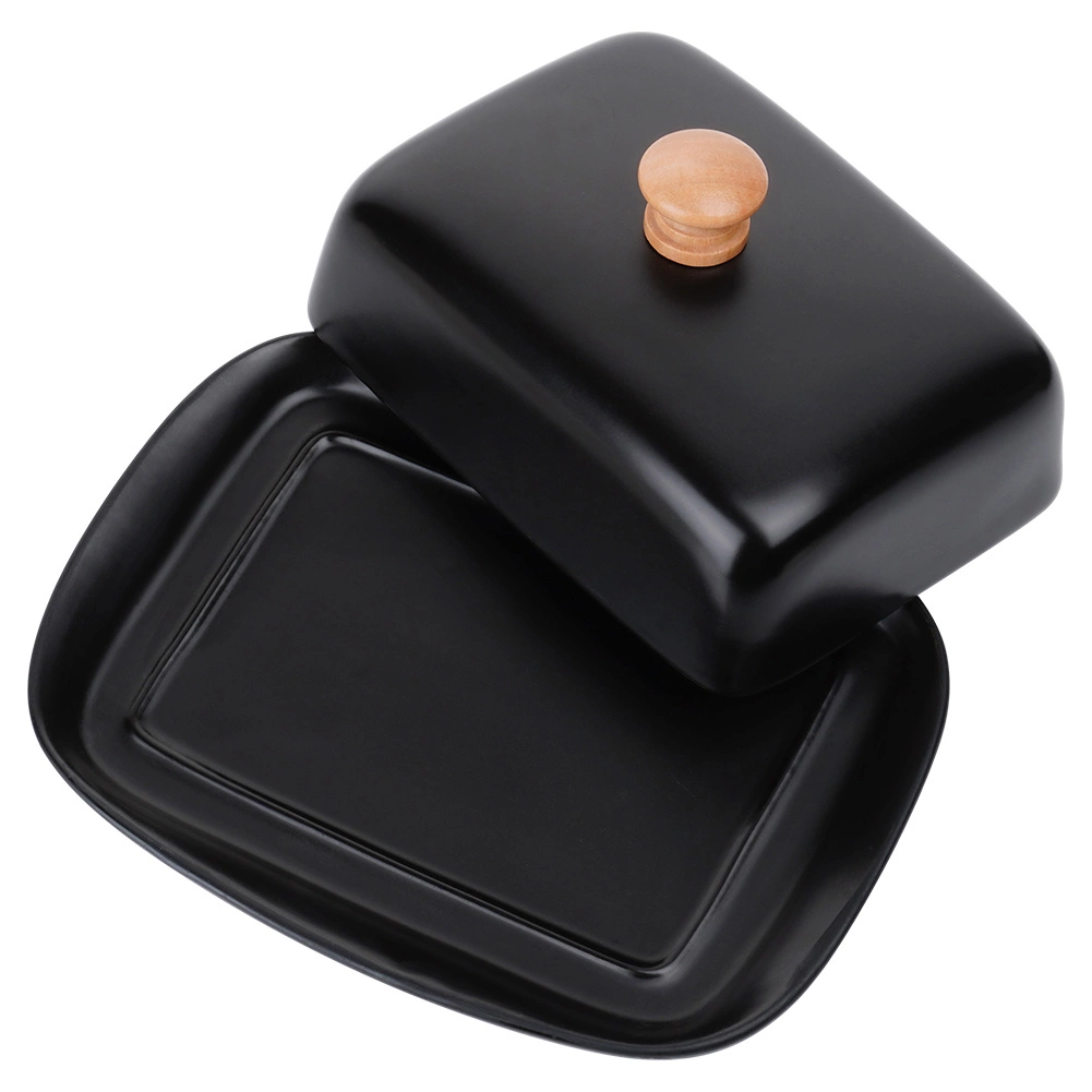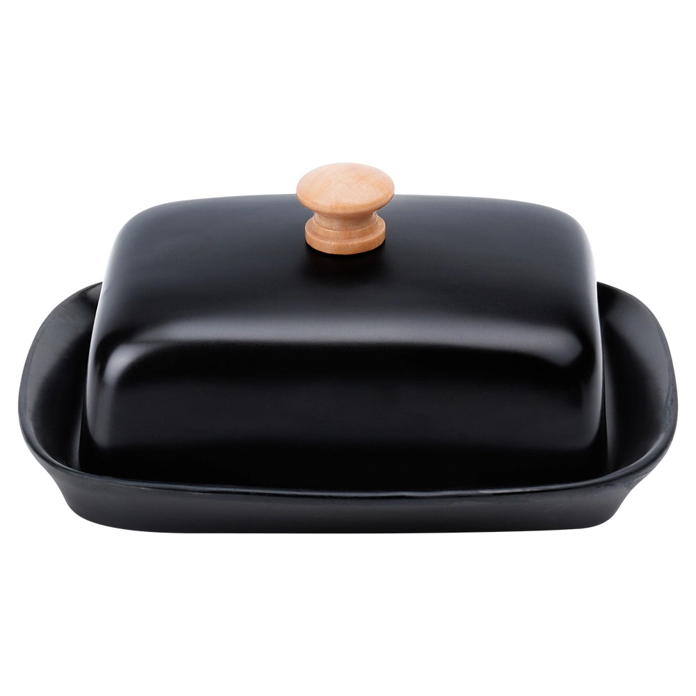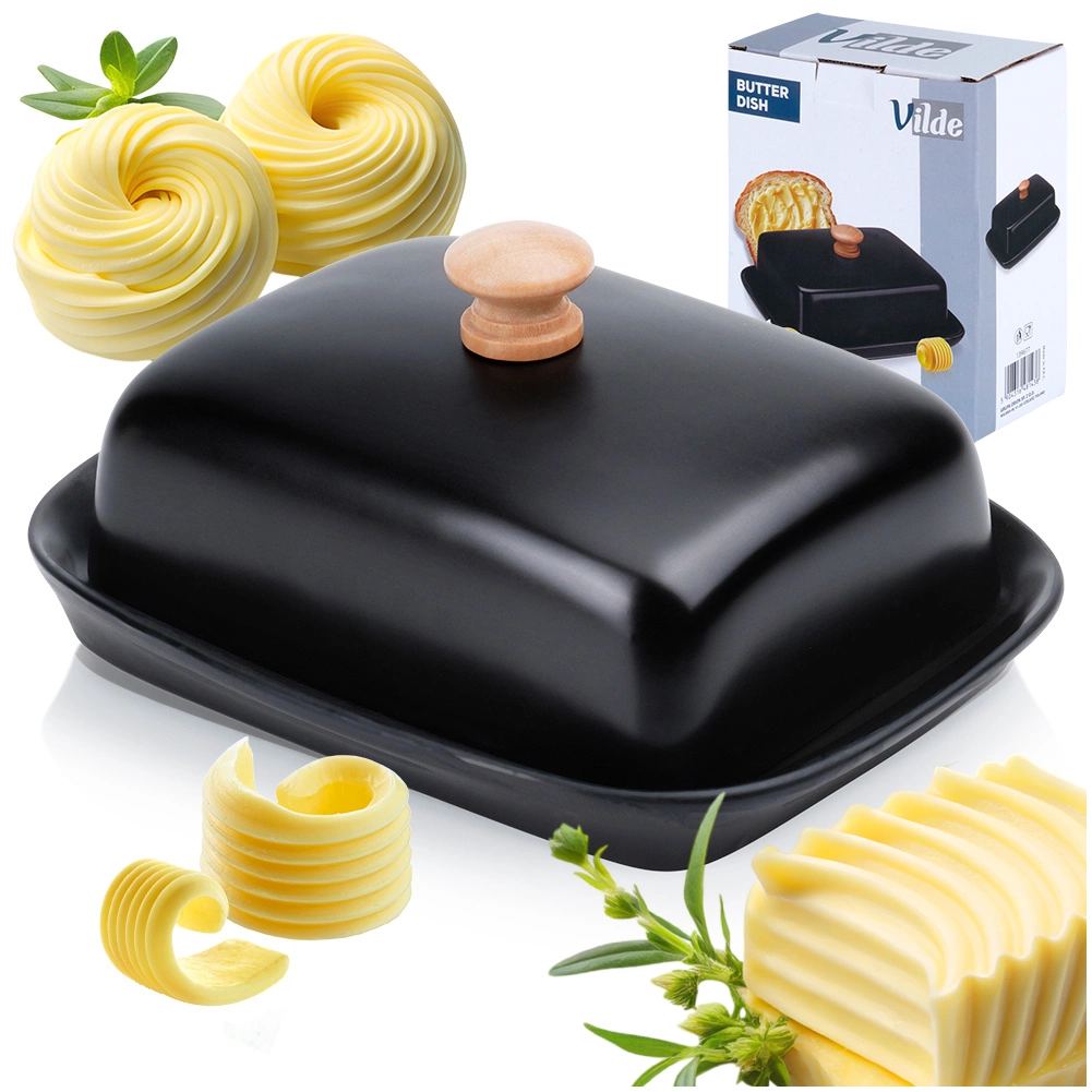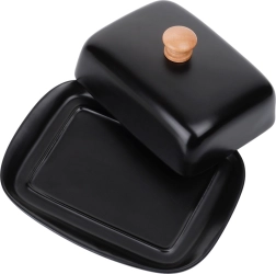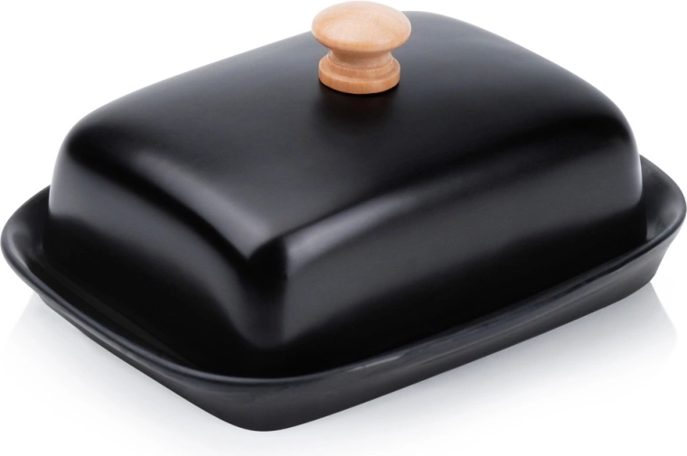 Táto štýlová maselnička z kvalitnej keramiky v čiernom prevedení je ideálna na každodenné použitie doma aj pri servírovaní na stole. Drevený úchyt na veku umožňuje pohodlné zdvíhanie, zatiaľ čo tesne priliehajúci kryt chráni maslo pred vysychaním a cudzími pachmi.