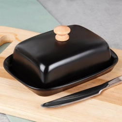 Elegantná čierna keramická maselnička s dreveným gombíkom na praktické uchovávanie a servírovanie masla. Kompaktné rozmery 16 × 12,5 × 7 cm, klasický tvar vhodný do každej kuchyne, veko na zachovanie čerstvosti a ľahké čistenie.