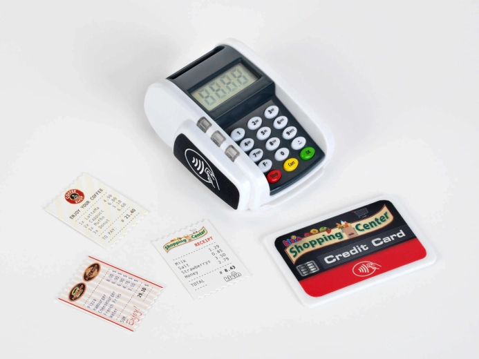 Tento kompaktný terminál verne napodobňuje skutočné zariadenie: deti môžu stláčať číselnú klávesnicu, prikladať platobnú kartu a tlačiť „účtenky“ pre realistickú hru na pokladňu. Svetelné a zvukové efekty dodajú každej transakcii ten správny nádych reality a podporia rozvoj sociálnych zručností.