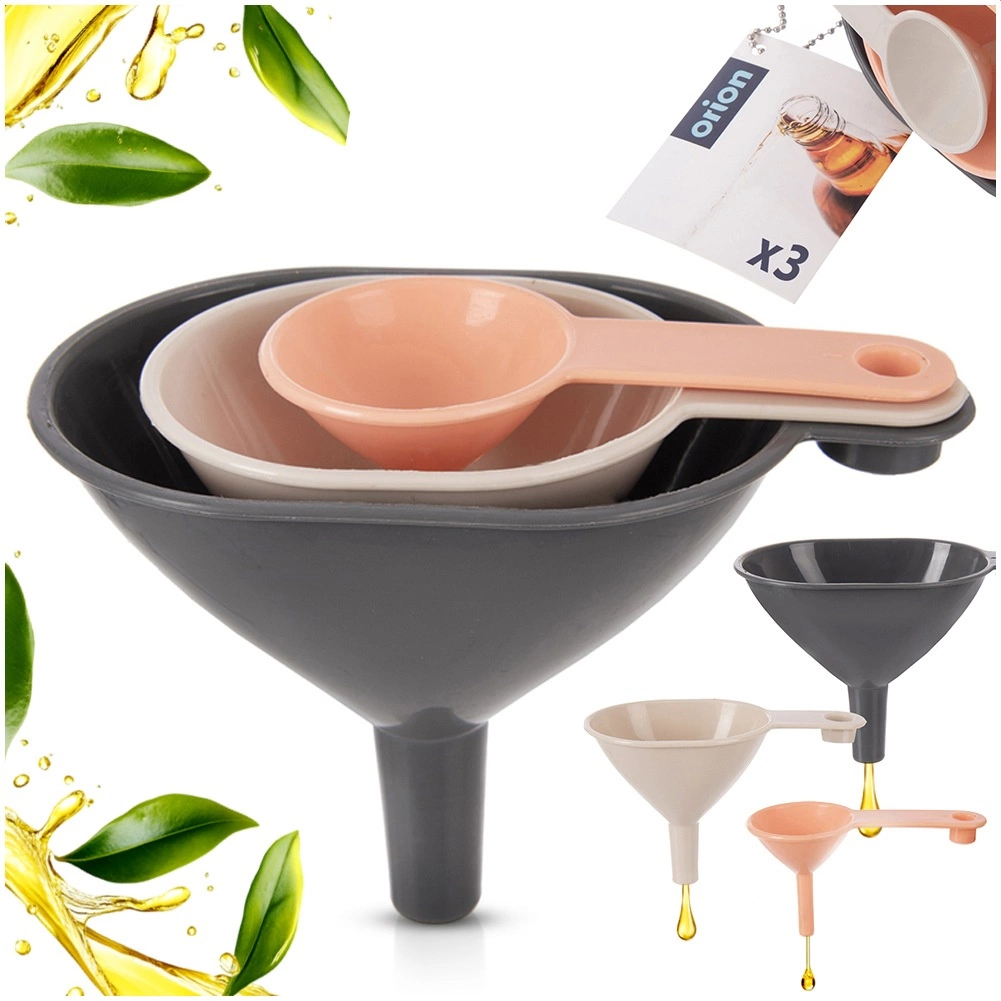 Uľahčite si každodenné varenie aj domáce zaváranie so sadou troch lievikov v praktických veľkostiach. Vďaka zúženým náustkom a pohodlným úchytom prelejete olej, sirup či víno a nasypete cukor, soľ alebo drobné semienka do nádob s úzkym hrdlom bez rozlievania a rozsýpania. Kompaktné rozmery a stohovateľné prevedenie šetria miesto v kuchyni.