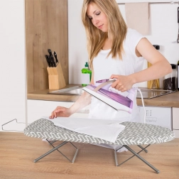 Šetrite miesto bez kompromisov v komforte žehlenia. Stolová žehliaca doska s rozmermi 77 × 31 × 18 cm má pevný kovový rám, protišmykové koncovky a bezpečnostný zámok proti samovoľnému zloženiu. Vďaka výsuvnému odkladaniu na žehličku budete mať prístroj vždy po ruke.