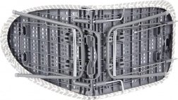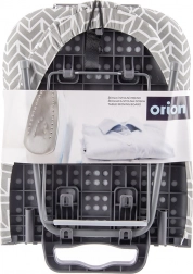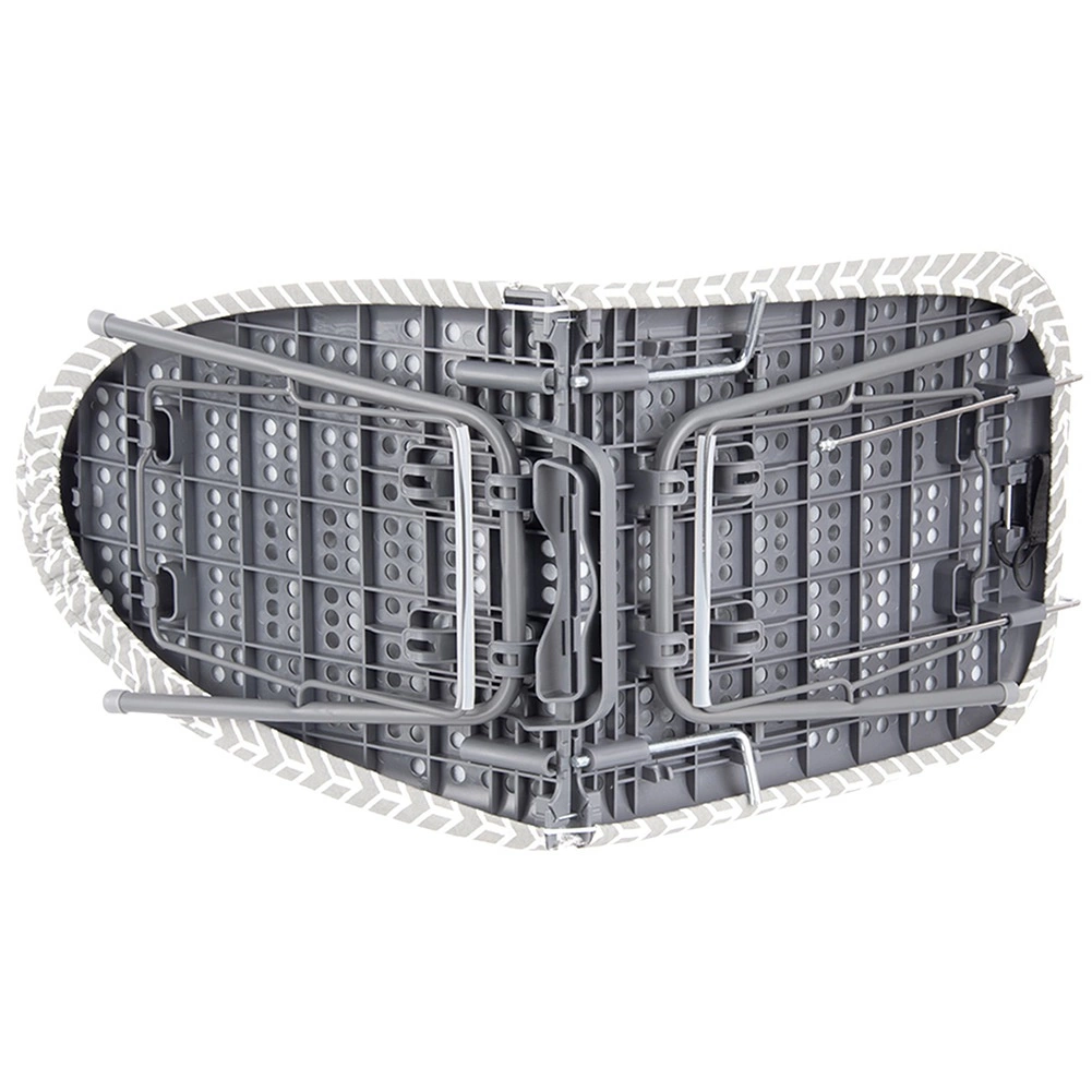 Kovový rám v sivej farbe, protišmykové nožičky a poistka proti samovoľnému zloženiu zaisťujú bezpečné a pohodlné žehlenie na akomkoľvek stole.