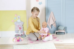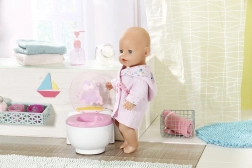 BABY born už chodí na záchod! Akonáhle si sadne na svoj biely trón s ružovým sedadlom, budeš počuť zvuky cikania, potlesku a veselého smiechu. BABY born sa ale vie aj vykakať. V tom prípade sa v mise objaví farebné trblietavé kakanie. Rýchlo, je čas spláchnuť! Keď stlačíš splachovacie tlačidlo, kakanie zmizne a budeš počuť zvuky spláchnutia.