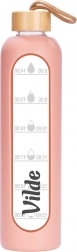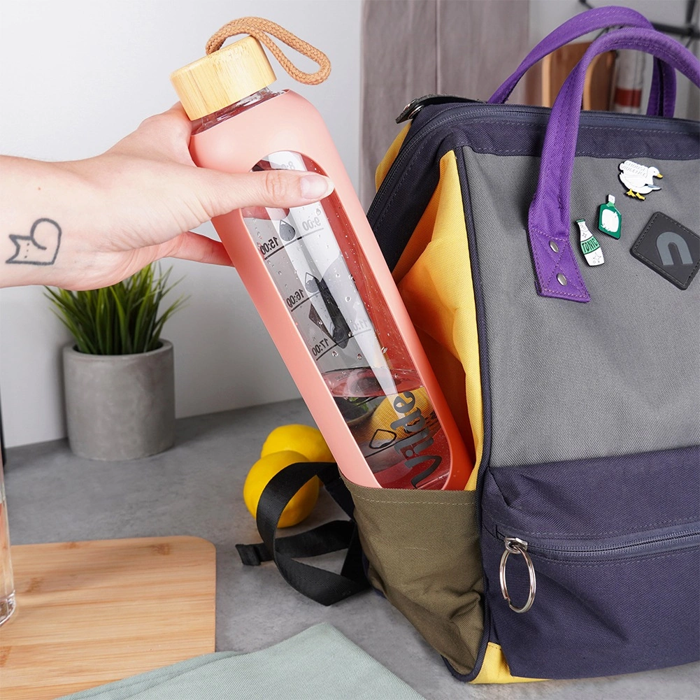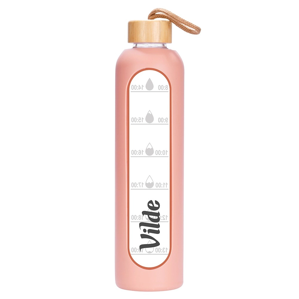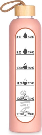 Udržiavajte si pitný režim štýlovo. Táto lososovo ružová fľaša kombinuje elegantný dizajn a praktickosť: odolné borosilikátové sklo, bezpečné bambusové viečko s textilným pútkom a silikónový obal pre istý úchop a ochranu pred rozbitím. Vďaka časovým značkám ľahko sledujete príjem vody počas celého dňa.