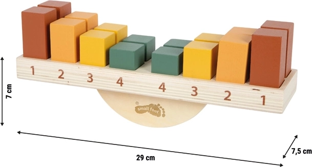 Číslovaná balančná doska na polkruhovej základni umožňuje deťom experimentovať s rozmiestnením blokov a okamžite vidieť dopad na rovnováhu.