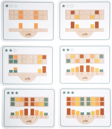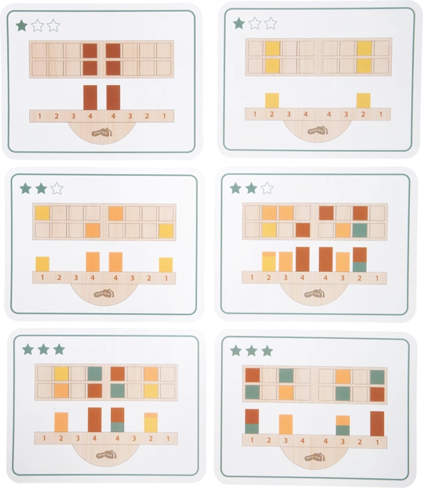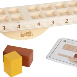 Táto Montessori balančná hra z kvalitného FSC certifikovaného dreva zoznamuje deti s princípmi rovnováhy, hmotnosti a páky. Deti umiestňujú farebné bloky na vyznačené pozície s číslami a sledujú, ako sa mení rovnováha. Môžu tvoriť vlastné stavby alebo plniť zadania z kartičiek s rôznou náročnosťou.