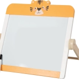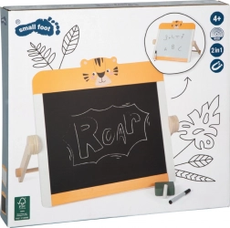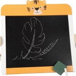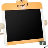Táto stolová tabuľa 2v1 kombinuje kriedovú plochu a bielu magnetickú suchostierateľnú tabuľu v jednom kompaktnom prevedení. Vďaka skladaciemu stojanu ju ľahko postavíte na stôl a po hre úsporne zložíte. Rozkošný motív safari tigríka podnecuje detskú fantáziu a inšpiruje k hrám na školu aj k samostatnému učeniu.