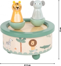 Táto klasická hracia skrinka prináša deťom pokojné naladenie pred spaním aj radosť pri hre. Dve drevené figúrky – tiger a slon – držia na hornej strane pomocou magnetov, počas prehrávania sa otáčajú a možno ich ľahko zložiť na samostatnú hru. Kvalitné laky a hladké povrchy sú šetrné k detským rúčkam.