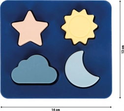 Roztomilé detské puzzle zo 100 % potravinárskeho silikónu bez BPA prináša bezpečné a zábavné učenie pre najmenších. Obsahuje 4 dieliky v tvare slnka, mesiaca, hviezdy a obláčika, ktoré možno vkladať z rôznych strán. Hračka je mäkká, nerozbitná, netoxická, ľahko umývateľná a ideálna na hranie doma, vo vode aj v piesku – perfektná na cesty a pre rozvoj jemnej motoriky a zmyslového vnímania.
