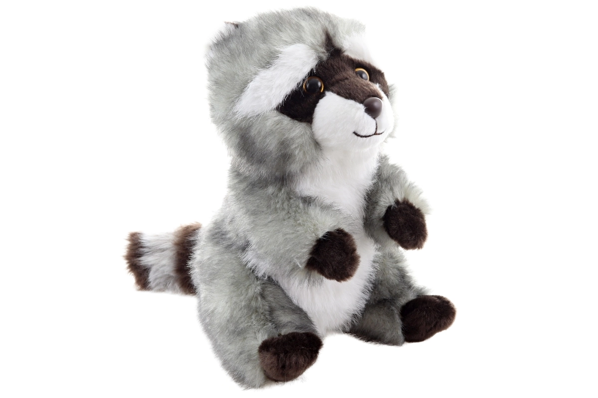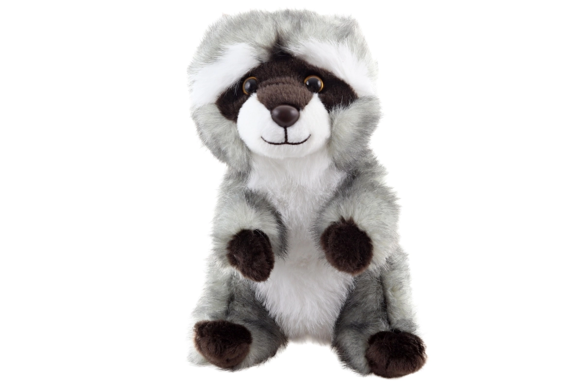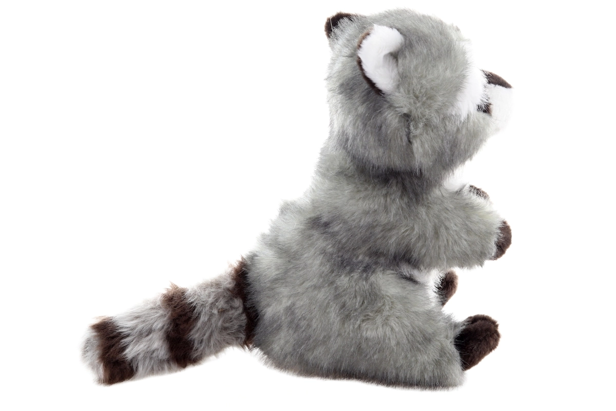 Výrazná maska, pruhovaný chvost a vyšívaný úsmev dodávajú mývalovi charakter a bezpečné prevedenie bez ostrých častí.