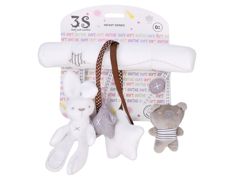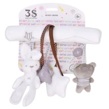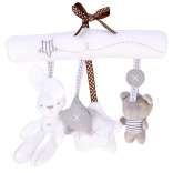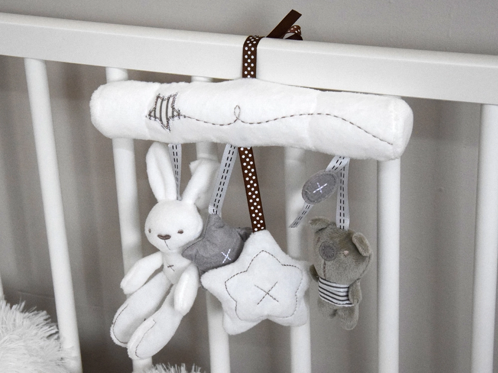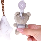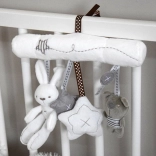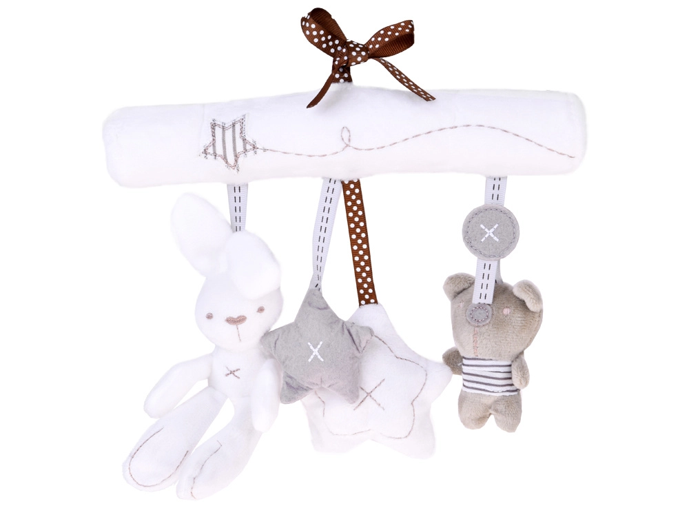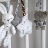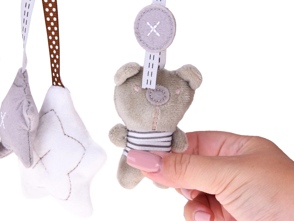 Roztomilá závesná hračka v neutrálnych farbách poteší bábätko doma aj na cestách. Ľahko ju pripevníte na postieľku alebo kočík pomocou stužiek. Ponúka mäkký hebký plyš, jemnú stimuláciu zmyslov a zábavné zvuky: po stlačení bruška zajačika zaznie krátka melódia, biela hviezdička má píšťalku a medvedík funguje ako hrkálka.