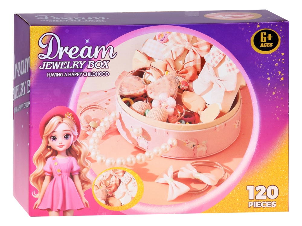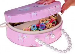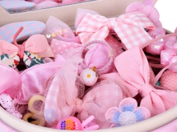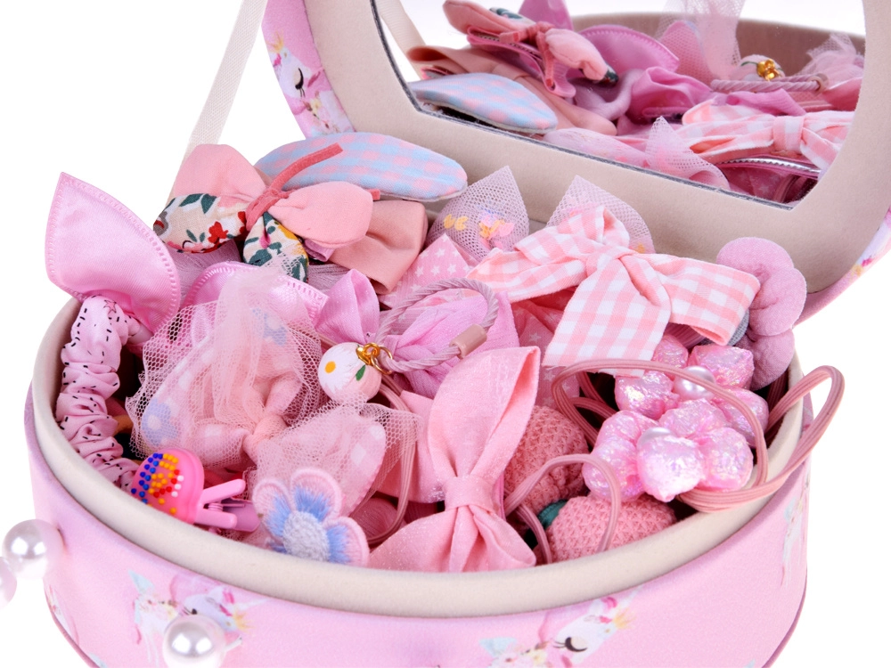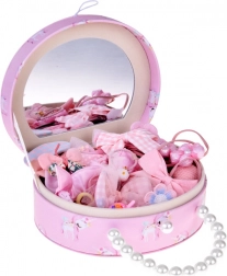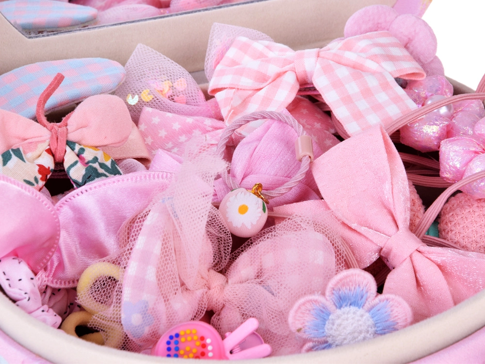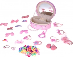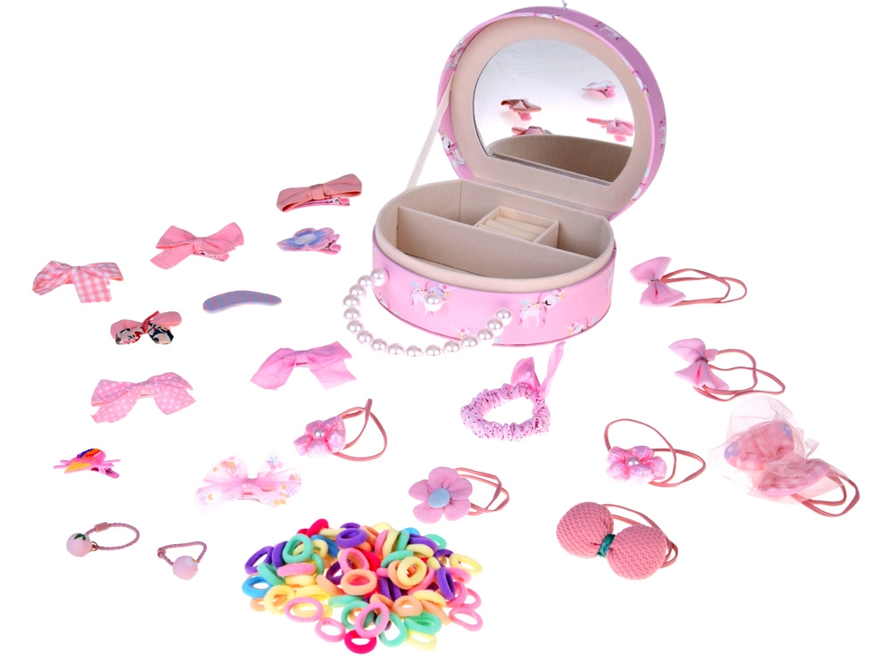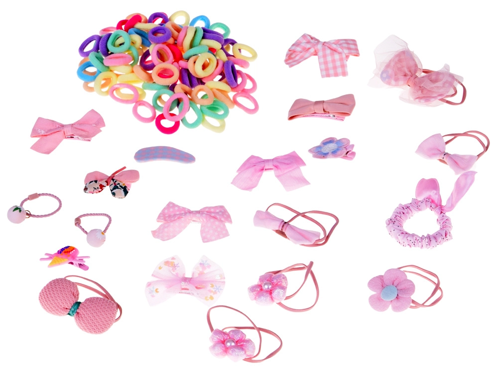 Bohatá sada doplnkov podporuje kreatívne česanie aj štýlové zdobenie vlasov. Nájdete tu 10 rôznych sponiek (mašličky, motýlik, kvietky, ovál), 10 ozdobných gumičiek (s kvietkom, mašľou, bambuľkou či uškami) a približne 100 mini gumičiek v pestrých farbách. Nechýba ani perličkový náhrdelník na doladenie outfitu.