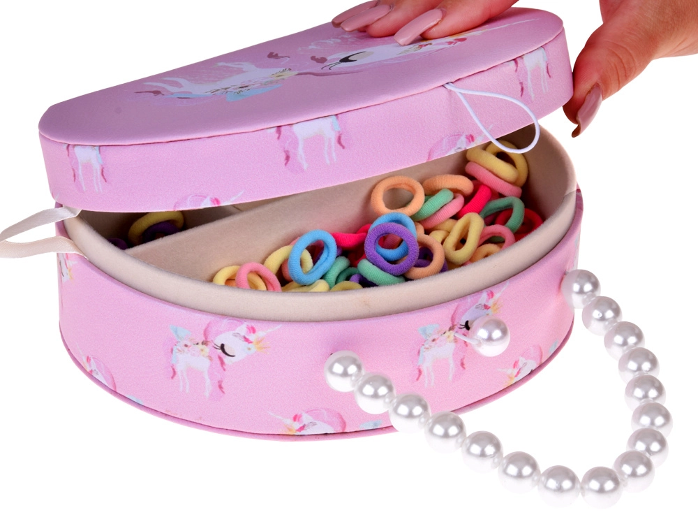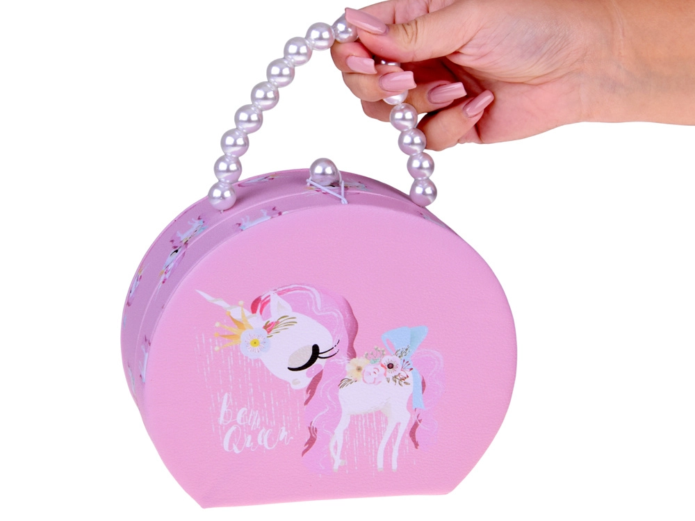 Elegantná oválna šperkovnica z eko kože v jemnej ružovej farbe zdobená jednorožcom je ideálna na ukladanie detskej bižutérie a vlasových doplnkov. Vo vnútri sa nachádza integrované zrkadielko, mäkké polstrovanie a 3 priehradky (2 malé a 1 veľká) vrátane miesta na prstienky. Perlová rukoväť uľahčí prenášanie na návštevy či prespanie u kamarátky.