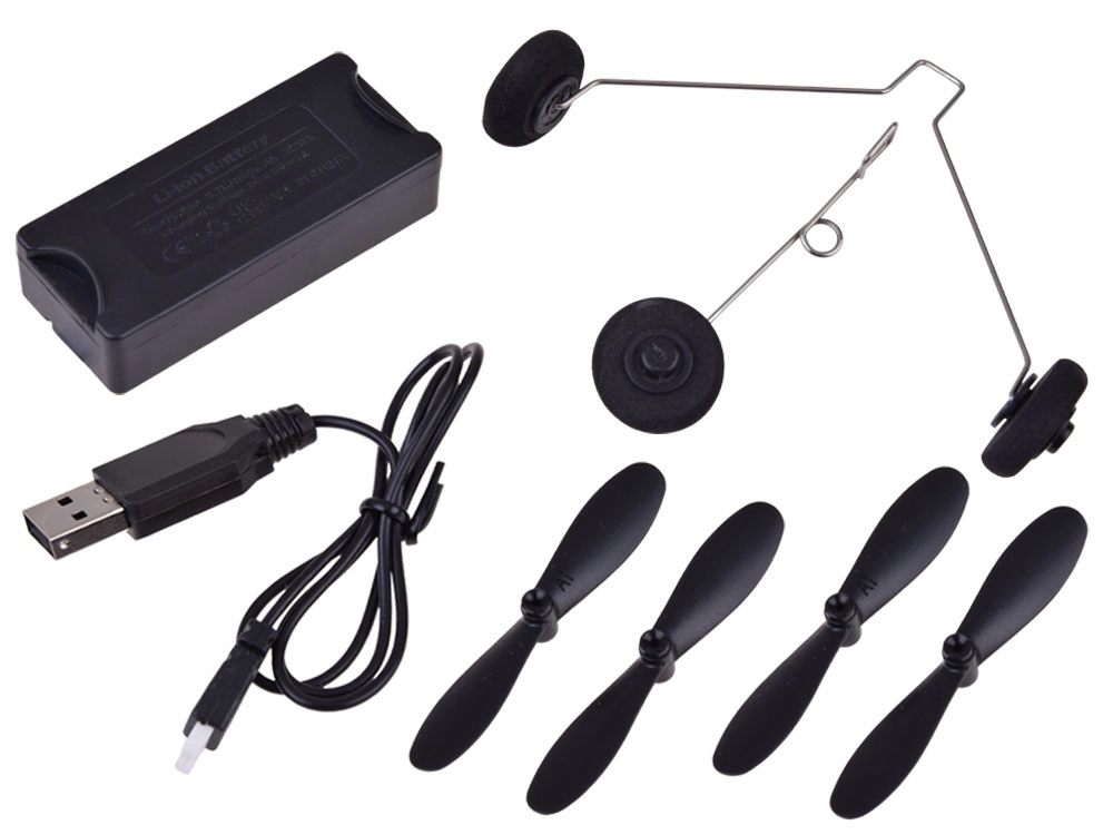 V balení nájdete náhradné vrtule, podvozok, USB kábel a RC vysielač 2,4 GHz. Stačí zložiť, nabiť a letieť.