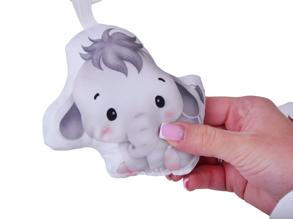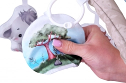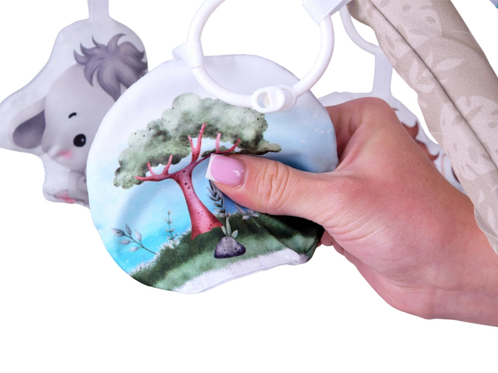 Roztomilý líštiak, levíček, sloník, šuštivý stromček a bezpečné zrkadielko možno ľahko premiestniť či odopnúť. Dieťa tak spoznáva rôzne tvary, štruktúry aj zvuky a trénuje jemnú motoriku.