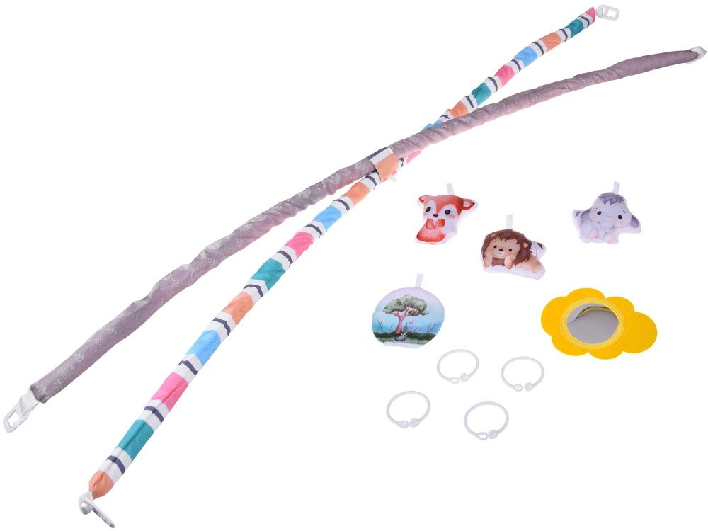 Dva polstrované, pružné oblúky so závesnými plyšovými hračkami a zrkadielkom motivujú bábätko k naťahovaniu, uchopovaniu a kopaniu – ideálne na tréning koordinácie oko–ruka a posilnenie svalov.