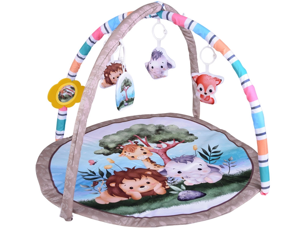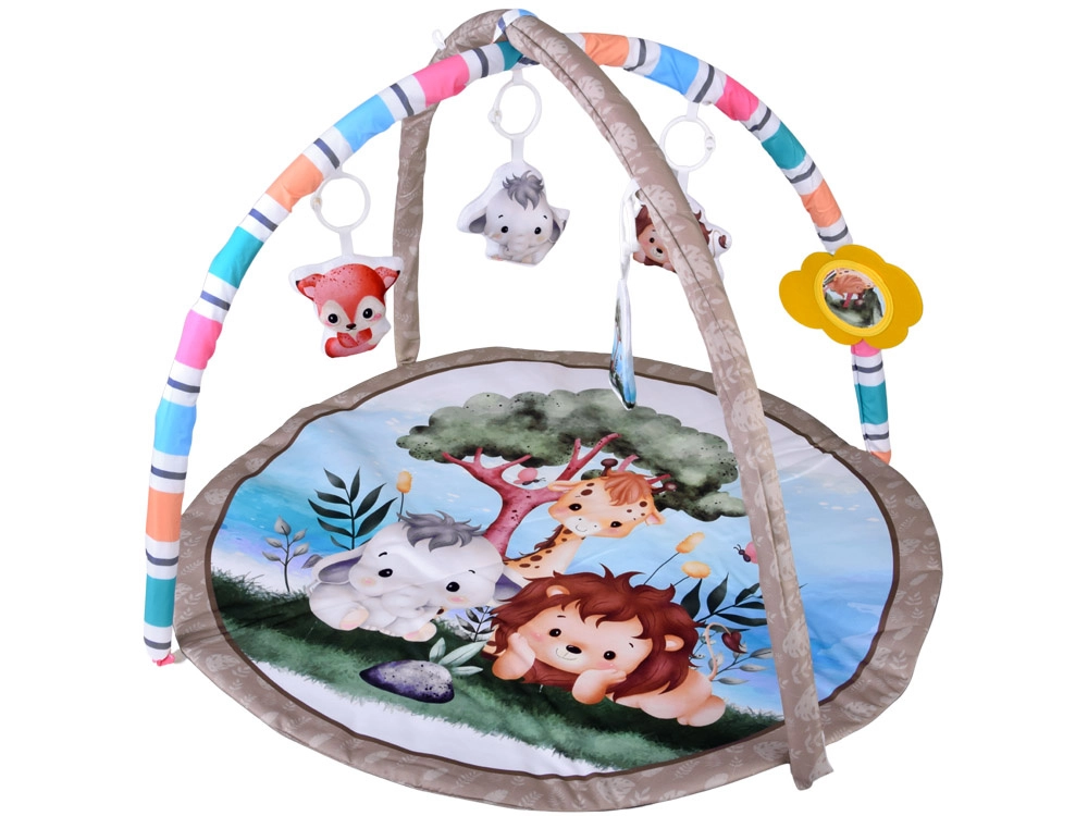 Táto okrúhla edukačná podložka so safari motívmi (lev, slon, žirafa) ponúka mäkké a útulné prostredie, ktoré podnecuje zvedavosť a samostatné objavovanie. Dva polstrované krížené oblúky so závesnými hračkami a bezpečným nezničiteľným zrkadielkom lákajú bábätko k naťahovaniu, chytaniu a kopaniu, čím podporujú hrubú aj jemnú motoriku.