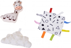 Hryzadlo, plyšová žirafa, mäkký obláčik, bezpečné zrkadielko, šuštivý štvorec s visačkami, kontrastné látkové knižky