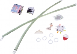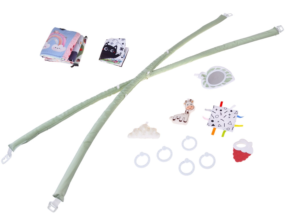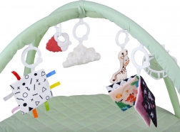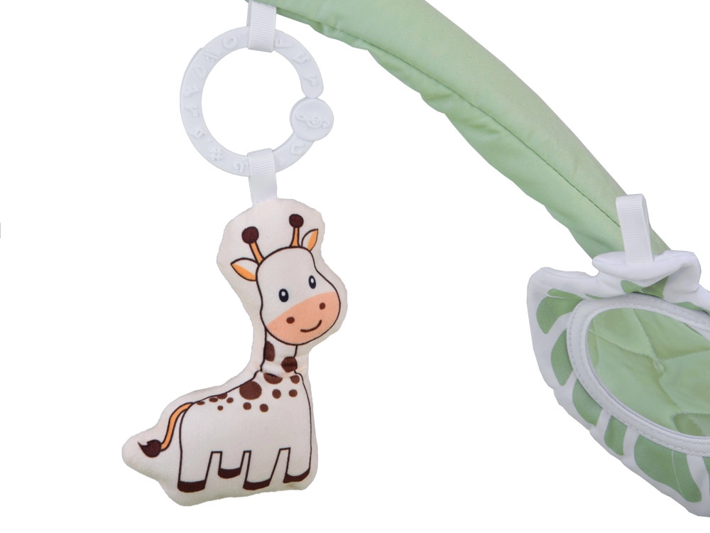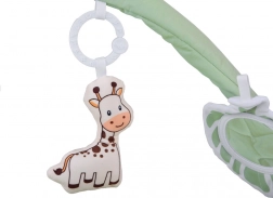 Dva pružné oblúky možno ľahko odopnúť na pranie či cestovanie. Zavesené hračky – hryzadlo, obláčik, žirafa a šuštivé štvorce – motivujú k naťahovaniu a rozvíjajú zmysly.
