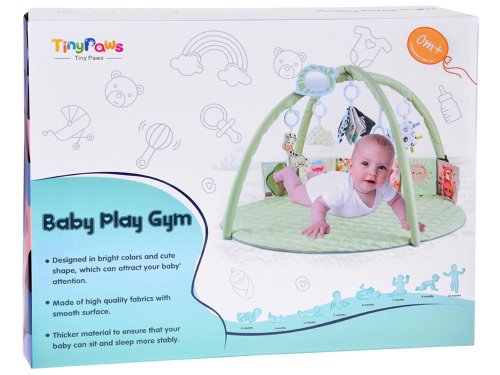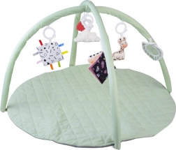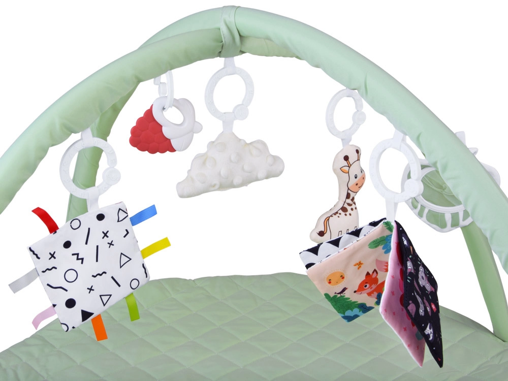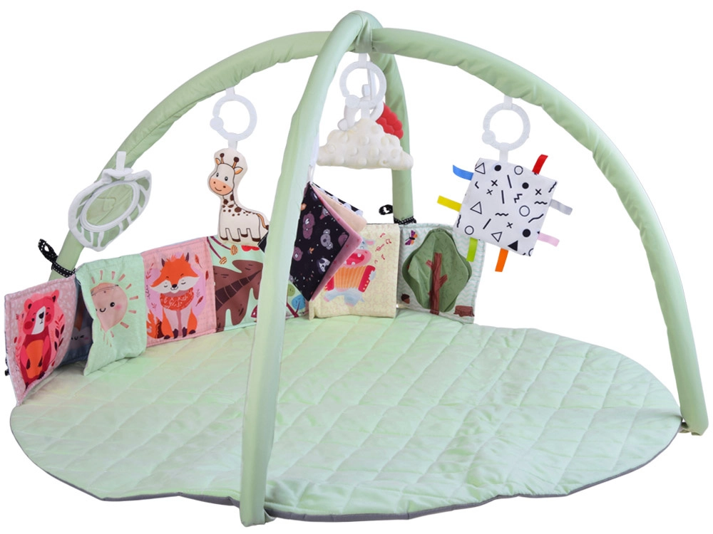 Táto okrúhla, jemne polstrovaná hracia deka v pastelovo mätovej farbe vytvára bezpečné a pohodlné miesto na každodenné objavovanie. Dva pružné oblúky s jednoduchým odopínaním umožnia rýchlu údržbu aj kompaktné zloženie na cesty. Rôznorodé textúry, šuštivé prvky a kontrastné vzory prirodzene rozvíjajú zrak, sluch aj hmat, zatiaľ čo závesné hračky motivujú k naťahovaniu, kopaniu a otáčaniu.