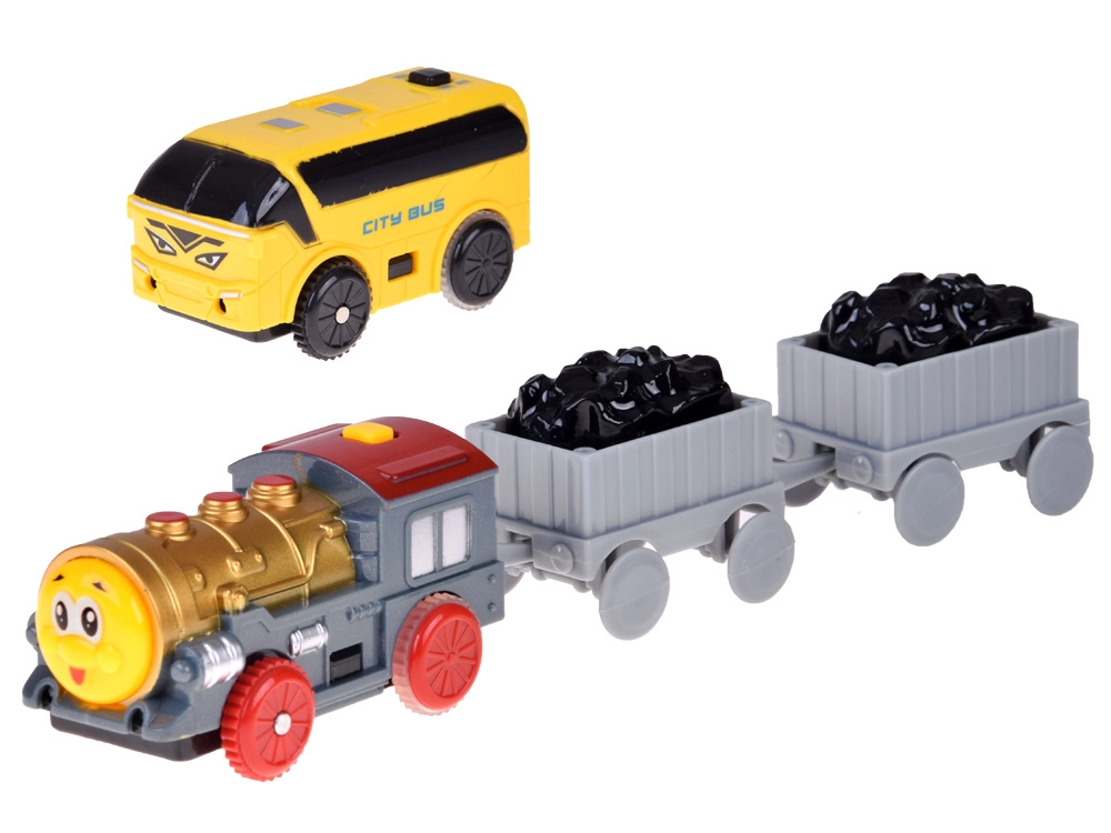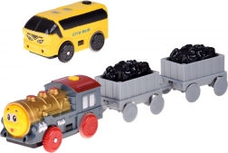 Parná lokomotíva ťahá uhoľné vozne, vydáva zvuky motora a prehráva veselé melódie. Deti si užijú autentickú jazdu po viacstupňovej trati.