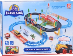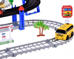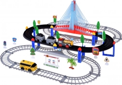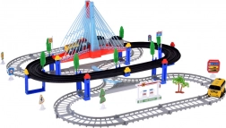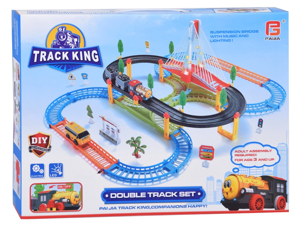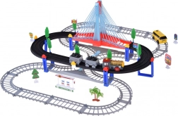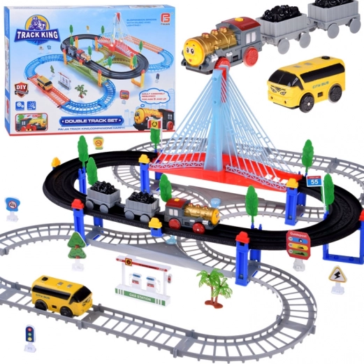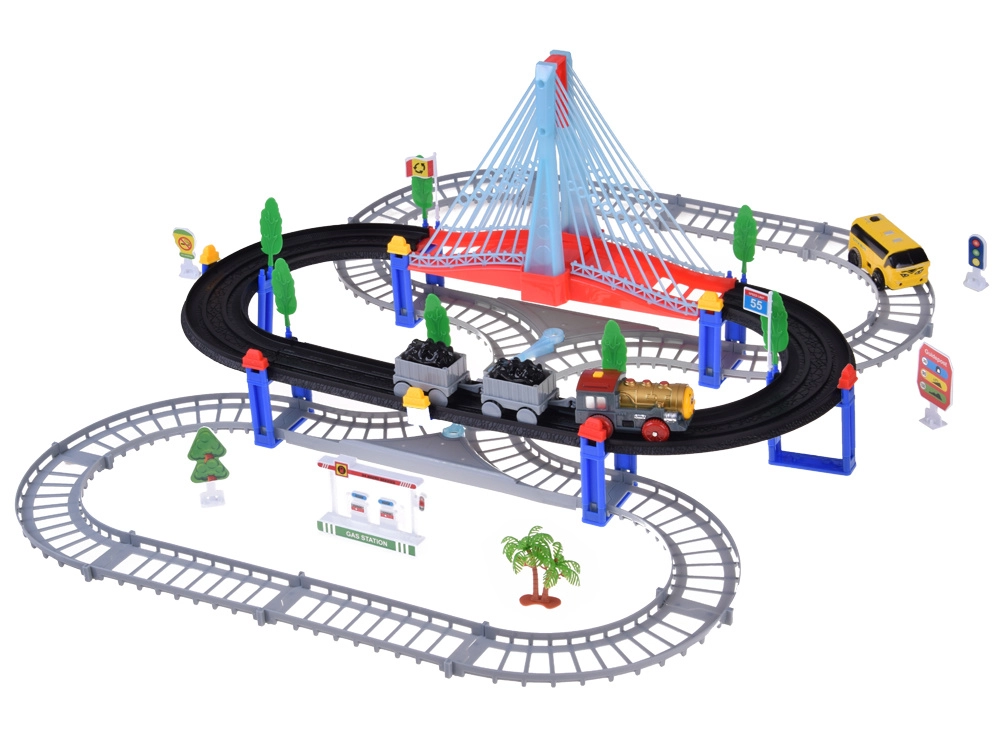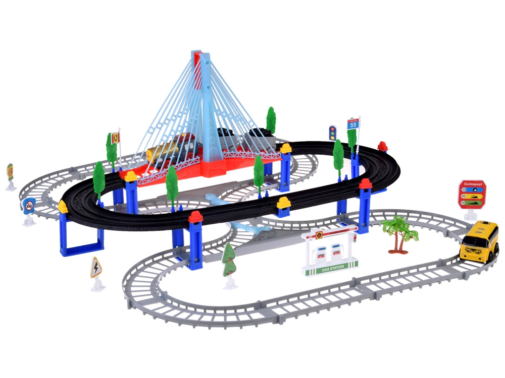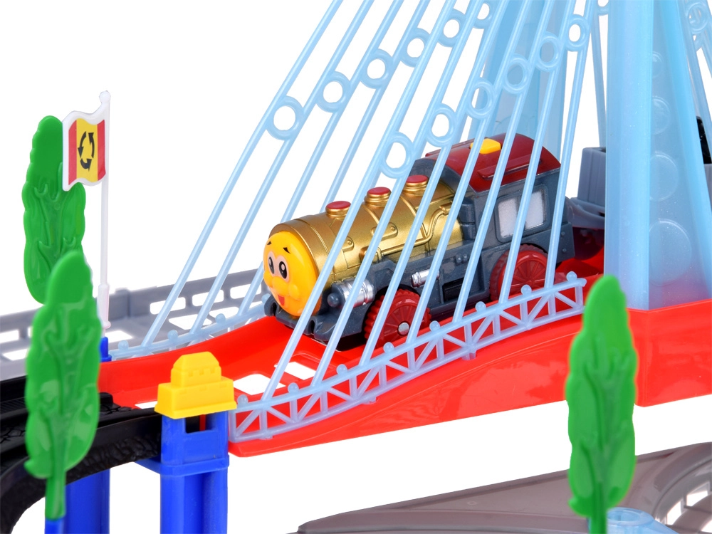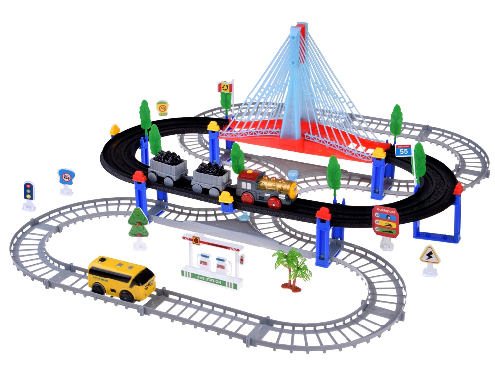 Táto elektrická vláčkodráha s viacúrovňovými koľajami a závesným mostom prináša deťom hodiny tvorivej hry. Lokomotíva s vozňami a žltý mestský autobus sa pohybujú po prepojených tratiach, prechádzajú cez most a míňajú dopravné značenie, stromčeky aj malú benzínovú stanicu. LED osvetlenie a zvuky lokomotívy s melódiami dodávajú hre na autentickosti.