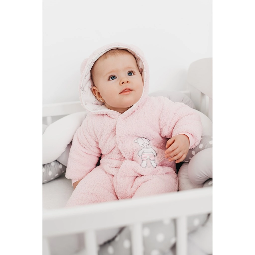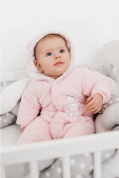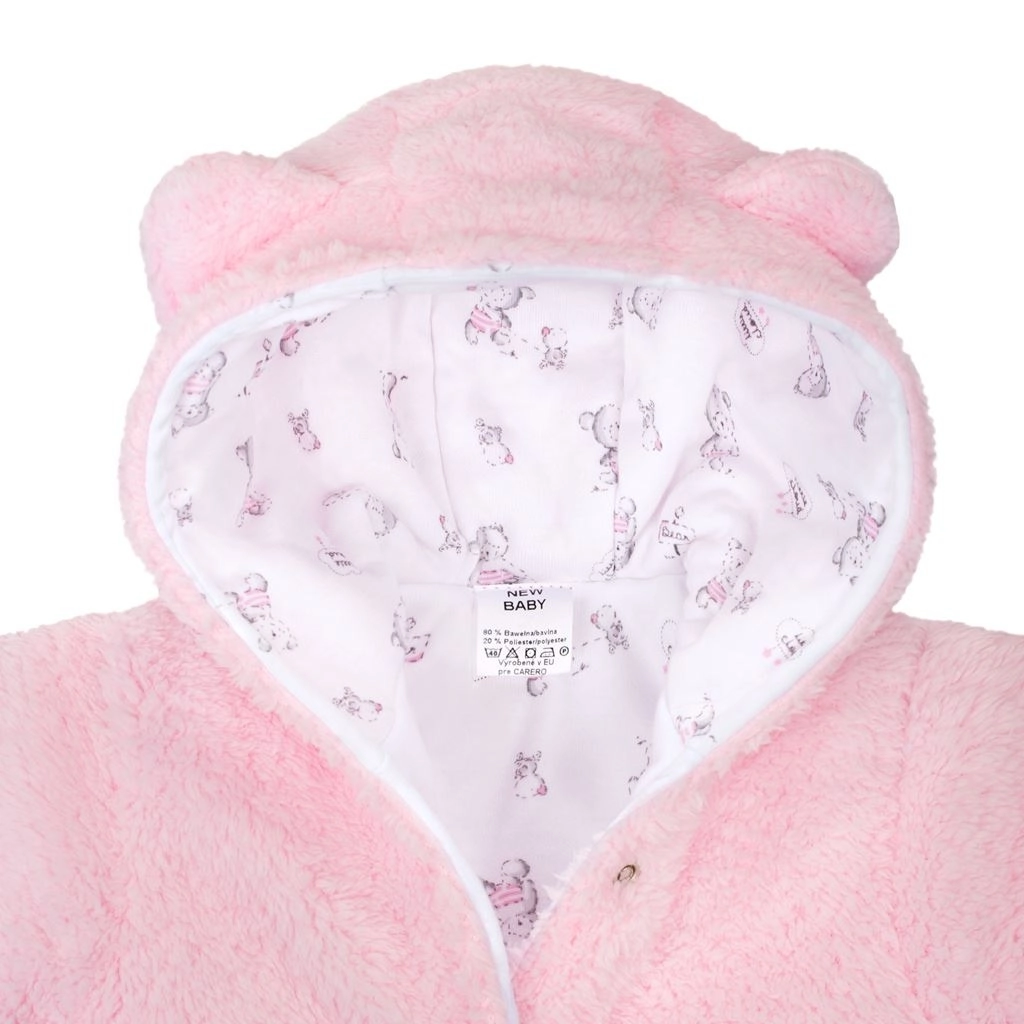 Táto zimná dojčenská kombinéza New Baby Nice Bear v ružovej farbe ponúkne vášmu bábätku útulné teplo a jemnosť počas celého chladného dňa. Vonkajšia flísová vrstva hreje, zatiaľ čo vnútorná 100 % bavlnená podšívka je šetrná k citlivej detskej pokožke. Roztomilý medvedík a kapucňa s uškami dodávajú kombinéze hravý vzhľad.