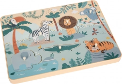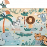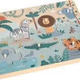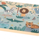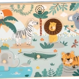 Drevené vkladajúce puzzle so zvukom premení prvé učenie na dobrodružstvo. Deti umiestňujú leva, tigra, slona, zebru, koalu, tukana a krokodíla na správne miesta a pri zdvihnutí dielika začujú autentický zvuk zvieraťa. Kvalitné spracovanie z FSC® certifikovaného dreva je príjemné na dotyk a šetrné k prírode.