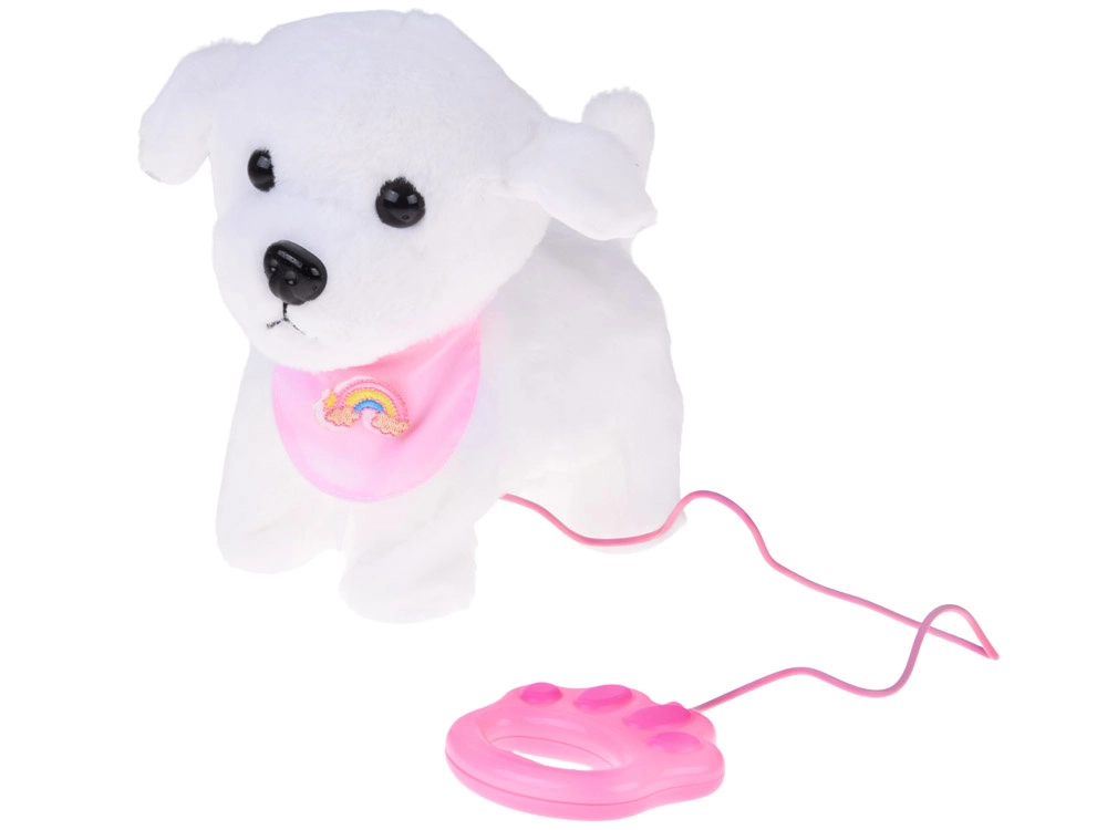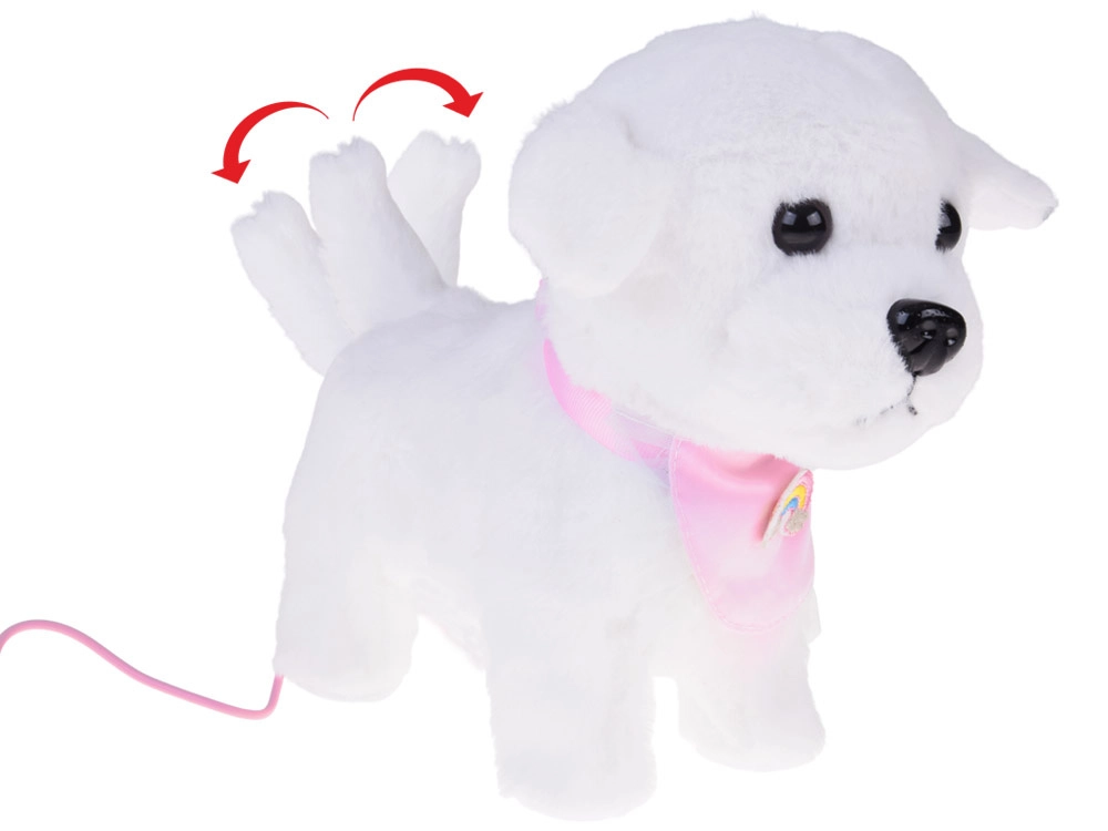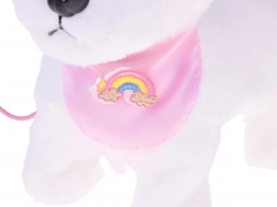 Roztomilý interaktívny plyšový psíček na vodítku poteší každého malého milovníka zvieratiek. Po stlačení tlačidla na vodítku chodí, šteká, vydáva realistické zvuky a kýva chvostíkom. Je vyrobený z mäkkého, na dotyk príjemného materiálu a zdobí ho roztomilá bandana s dúhou – ideálny kamarát na každodenné hranie aj ako skvelý darček.