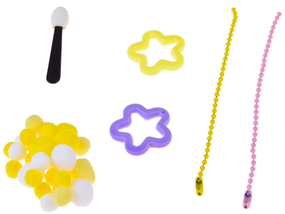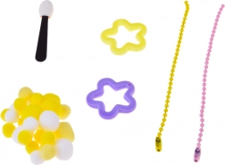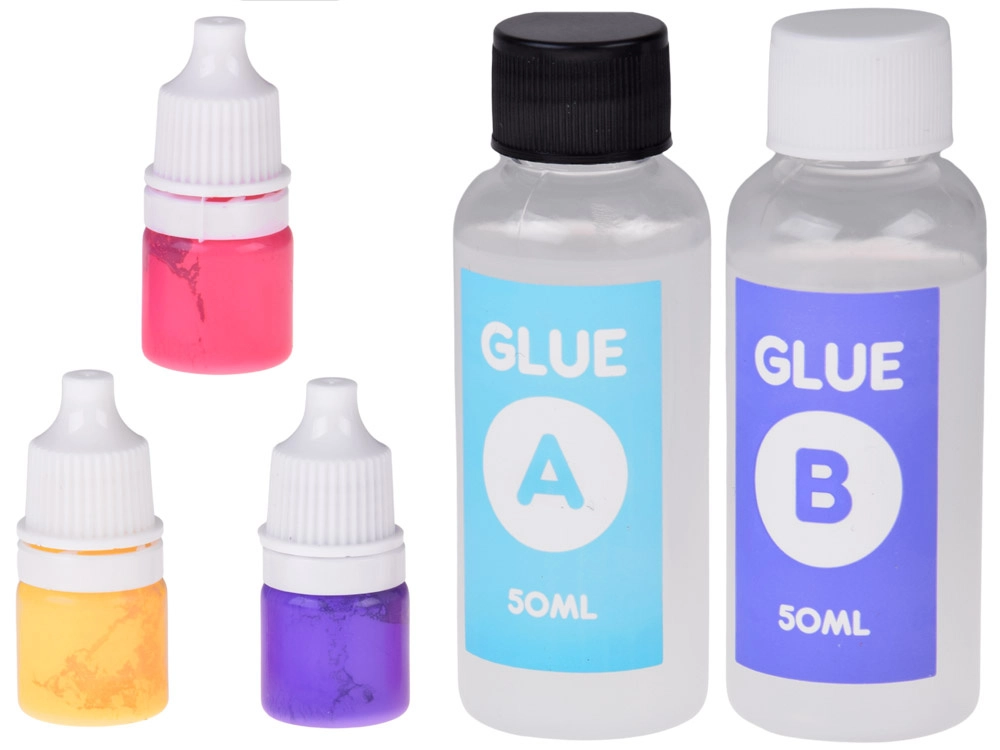 - Forma na 2 slizy, miešacia tyčinka, klieštiky, 2× lepidlo (A+B), odmerka, hubka/pacynka, 3× farbivo, mäkké dekoračné guličky, ochranné rukavice, 2× hviezdička, 4× priehľadný kelímok, 2× ozdobné vrecúško, 2× retiazka na prívesok, tácka