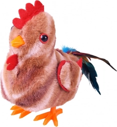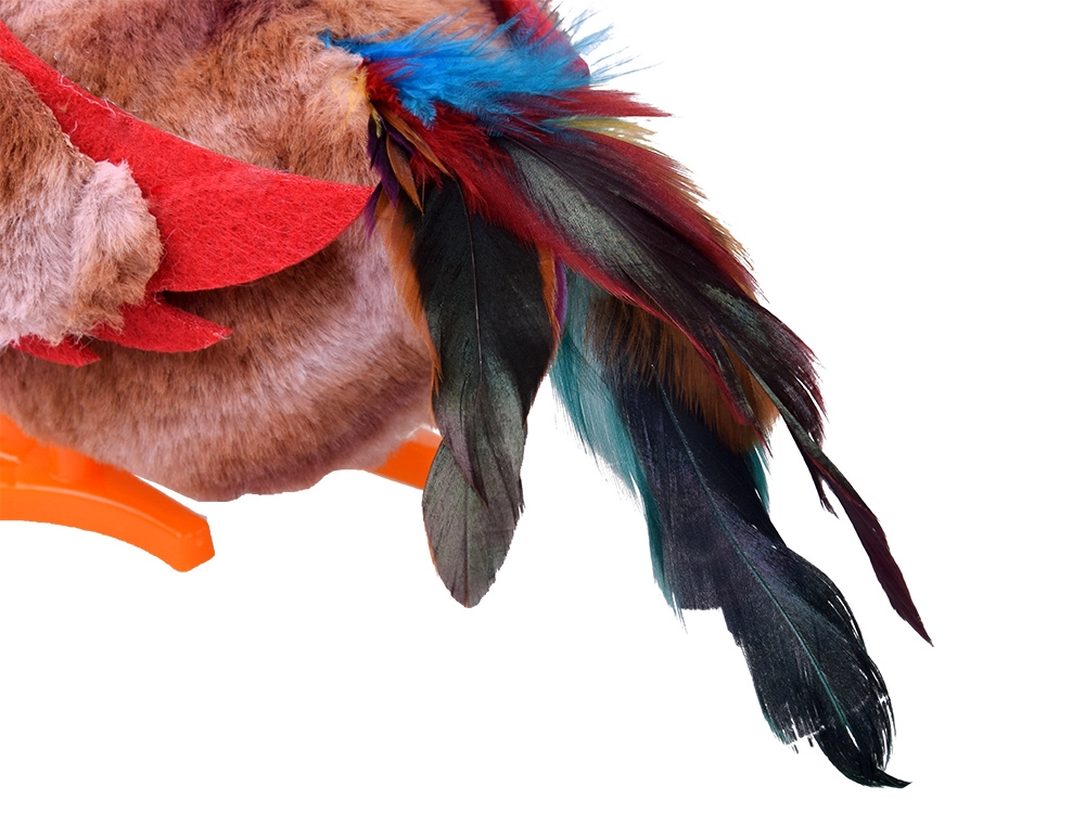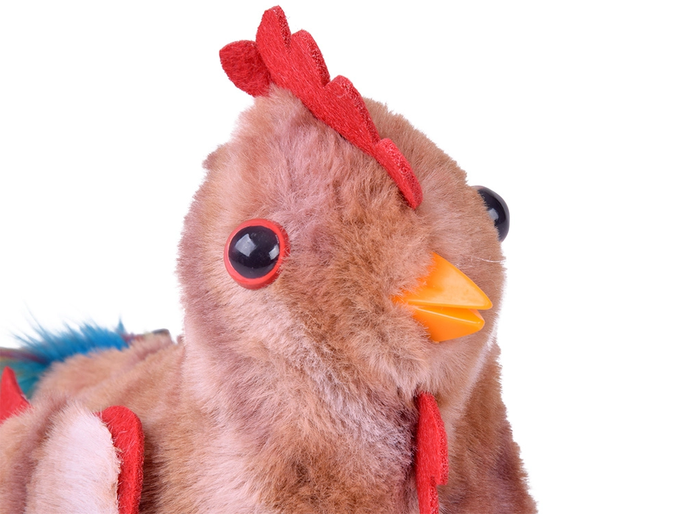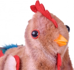 Príjemný plyš, červený hrebeň a pestrofarebný chvost potešia na dotyk aj na pohľad – vhodné na maznanie aj ako dekorácia.