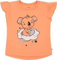 Roztomilé dvojdielne detské pyžamo New Baby Dream v lososovej farbe prináša mäkkú 100% bavlnu, pohodlný strih a elastický pás, ktorý netlačí na bruško. Tričko s krátkym rukávom zdobia volániky a milý motív koaly na obláčiku, kraťasy majú celoplošnú potlač a jemné volániky na nohavičkách. Ideálne na leto aj ako pohodlné domáce oblečenie.