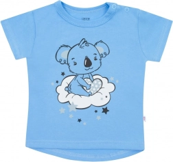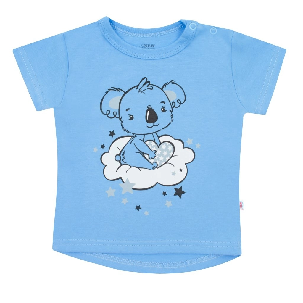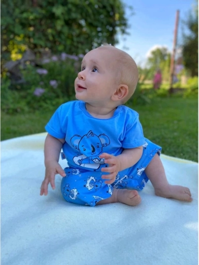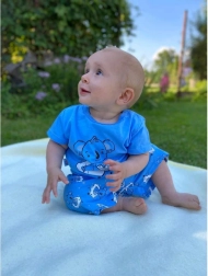 Roztomilé detské letné pyžamo New Baby Dream v modrej farbe z príjemnej 100% bavlny. Set tvorí tričko s krátkym rukávom a kraťasy. Tričko zdobí roztomilý motív medvedíka na obláčiku a hviezdičky, má praktické zapínanie na ramene na patentky pre ľahké obliekanie. Kraťasy sú s celoplošnou potlačou medvedíkov a majú širší elastický pás, ktorý je pohodlný a netlačí na bruško. Ideálne ako letné pyžamko aj pohodlné domáce oblečenie pre bábätko.