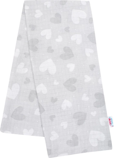 Bavlnená detská plienka NEW BABY so vzorom sivých srdiečok kombinuje praktickosť a pohodlie na každý deň s bábätkom. Vďaka 100 % bavlne je príjemná na dotyk, dobre saje a je šetrná k citlivej pokožke novorodencov. Univerzálny rozmer umožňuje široké využitie doma aj na cestách.