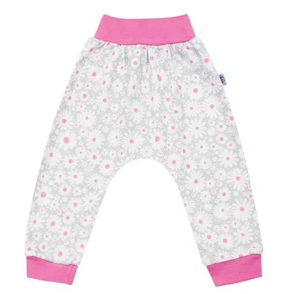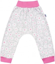 Tepláky majú širší pohodlný pás, sú zúžené pri nohaviciach s lemom a po celej ploche ich zdobí kvetinová potlač. Vďaka 100 % bavlne je súprava mäkká, priedušná a šetrná k pokožke bábätka.