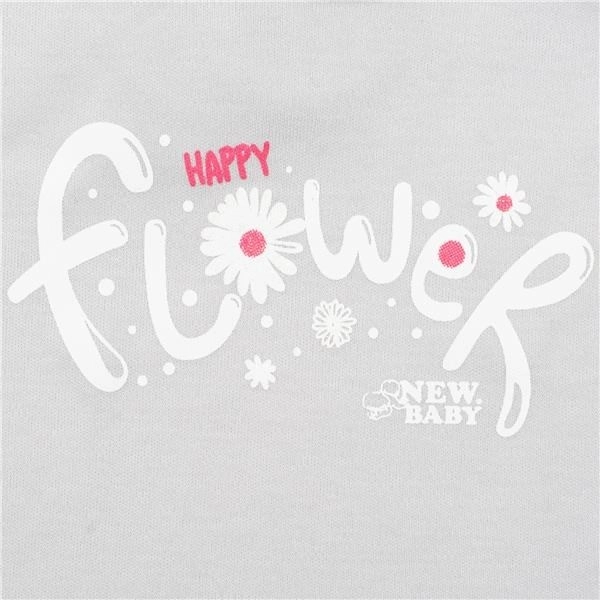 Táto štýlová súprava NEW BABY Happy Flower poteší jemným dizajnom aj praktickosťou. Tričko zdobí nápis Happy flower a elegantné volánikové rukávy, zatiaľ čo tepláčky s celoplošným kvetinovým motívom majú pohodlný širší lem v páse aj na nohaviciach. Vďaka 100% bavlne je komplet mäkučký, priedušný a šetrný k citlivej pokožke bábätka.