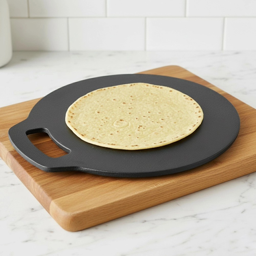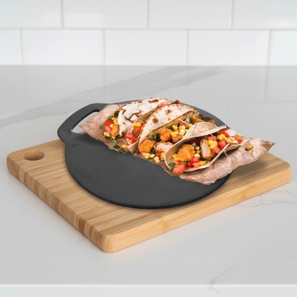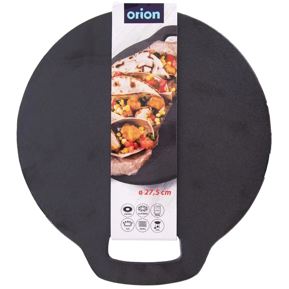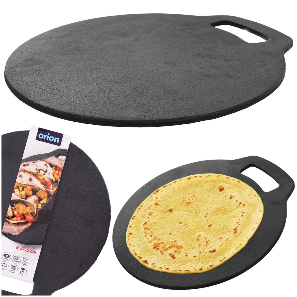Univerzálna liatinová panvica s priemerom 25 cm na prípravu tortíl, palaciniek, zemiakových placiek aj pizze. Masívna liatina výborne vedie a udržuje teplo, je odolná voči vysokým teplotám a hodí sa na plynové, elektrické, sklokeramické, halogénové aj indukčné varné dosky, do rúry, na gril aj priamo na oheň.