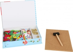 Dieliky majú predvŕtané otvory, takže klinčeky sa dajú hladko pribíjať. Drevené kladivko skvelo padne do detskej ruky a práca je vďaka korku tichá a stabilná.