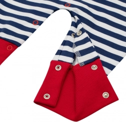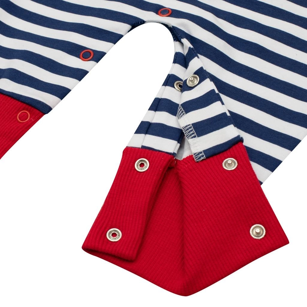 Chlapčenský letný overal New Baby Marine je ideálnou voľbou na teplé dni. Ľahká a priedušná čistá bavlna zaisťuje maximálne pohodlie, zatiaľ čo moderný pruhovaný dizajn a rozkošná nášivka lodičky dodávajú outfitu námornícky šmrnc. Nášivka je z rubovej strany podložená látkou, aby nedráždila citlivú pokožku.