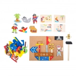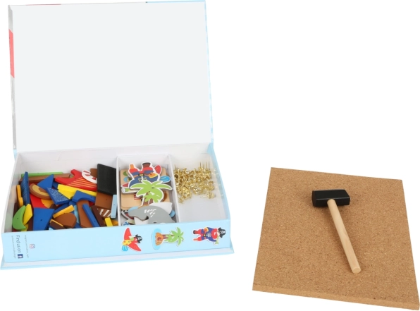 - drevené dieliky s pirátskymi motívmi, zlaté pripináčiky, pružná korková doska, drevené kladivko, 4 obojstranné karty s návrhmi, úložný box