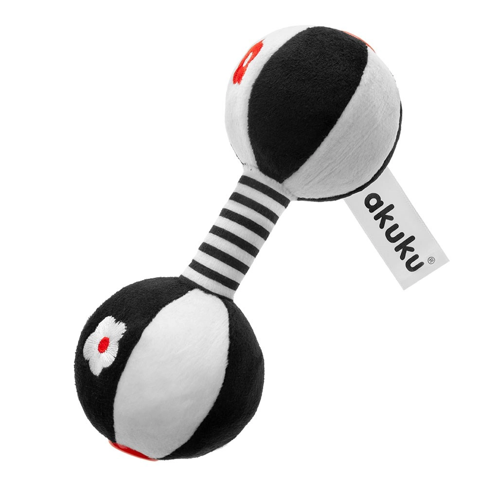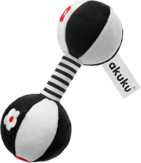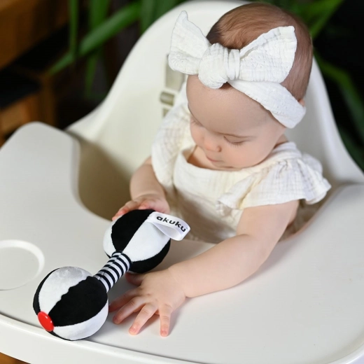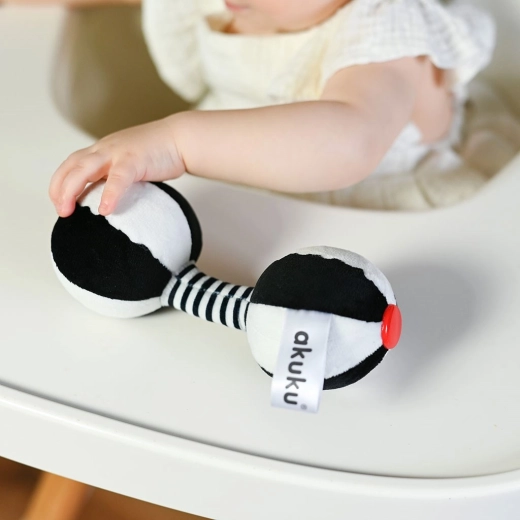 Táto kontrastná hračka v tvare činky je vyrobená z príjemnej plyšovej látky, ktorá je šetrná k citlivej detskej pokožke. Kontrastné čiernobiele prvky bábätko zaujmú a podporujú vizuálne vnímanie od prvých dní. Vo vnútri sú umiestnené jemné zvončeky, ktoré pri pohybe vydávajú zvuk a pomáhajú rozvíjať sluchové vnemy.