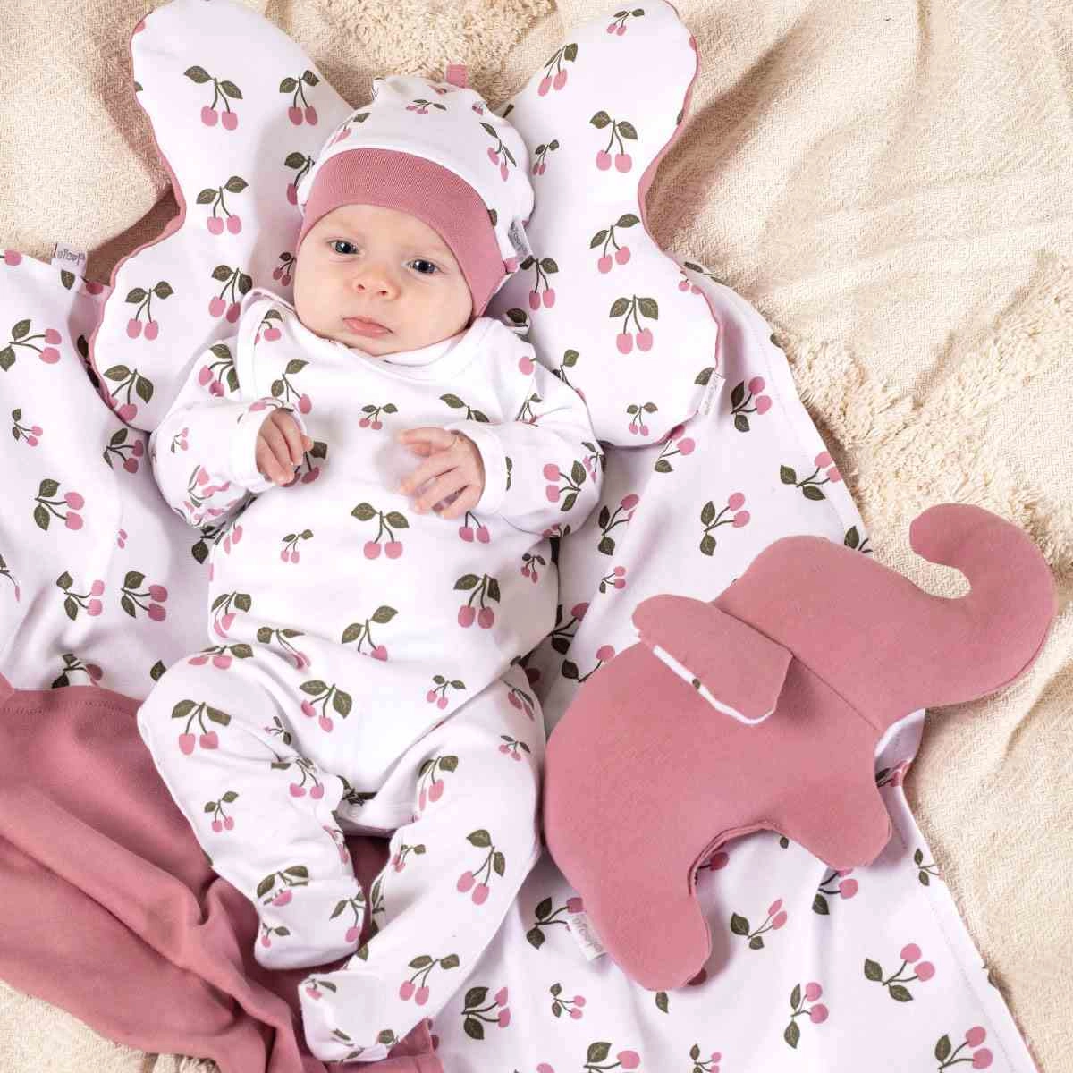 Čiapočka je ušitá zo 100% bavlny, ktorá je priedušná, mäkká a šetrná k detskej pokožke. Hodí sa ako štýlový doplnok k outfitom aj ako praktická vrstva po kúpaní alebo na spanie.